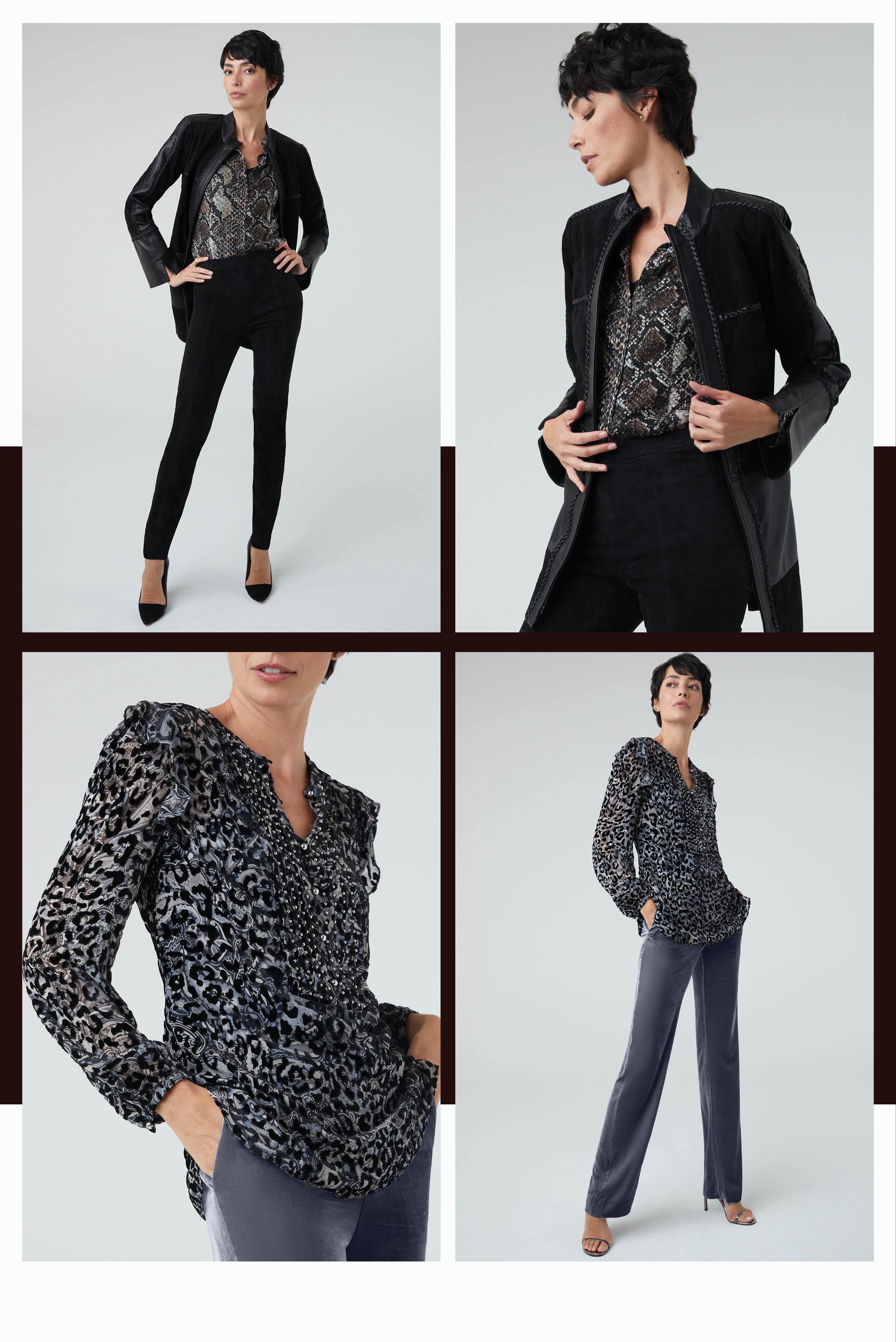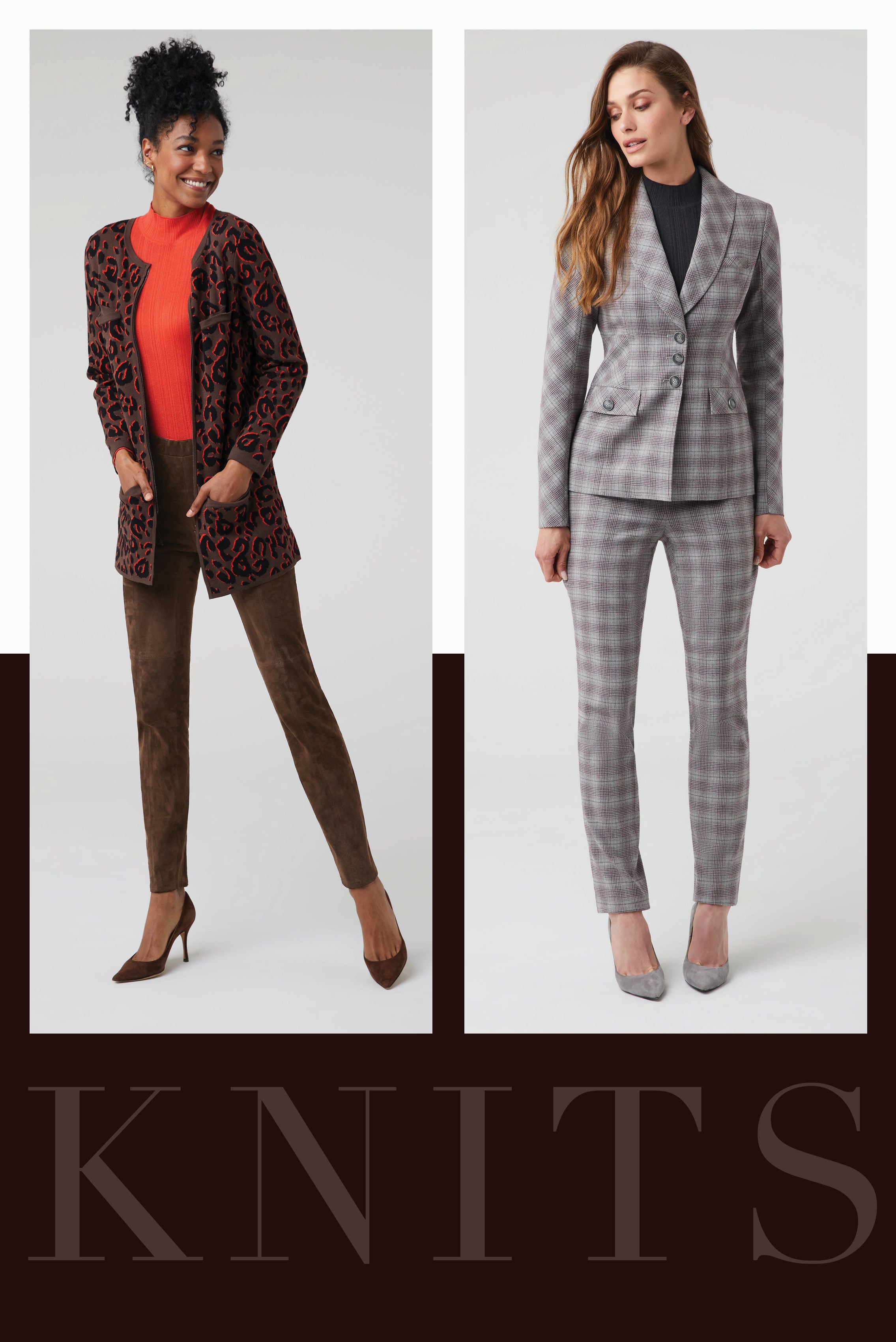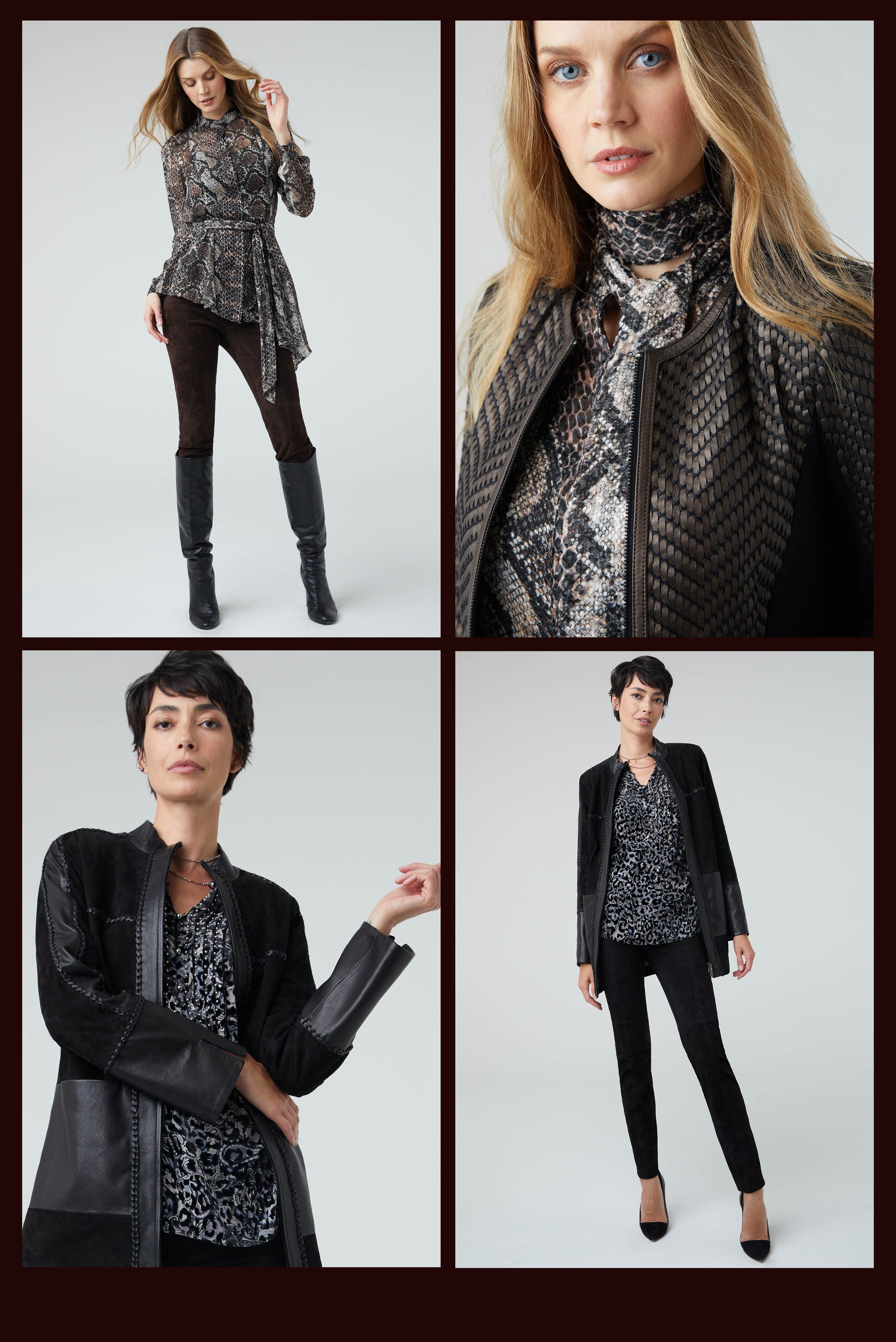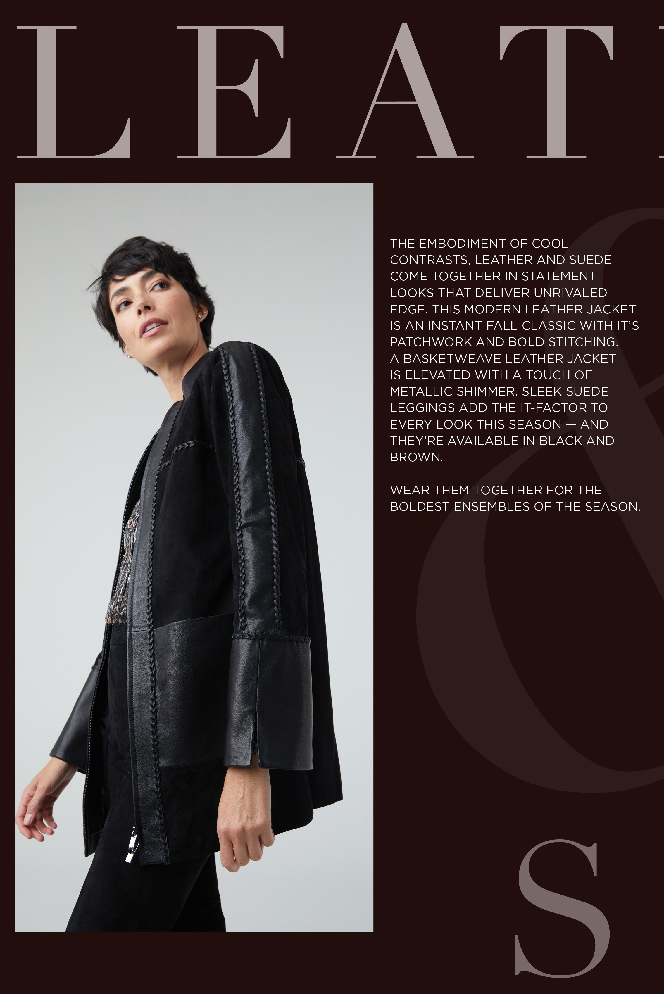 Bold animal prints meet sleek suede and textured leather for looks that take a walk on the wild side. lend edge to your look with a statement basketweave leather jacket. up the ante on texture when you add a leather accented suede jacket that features bold stitching details. rich suede leggings, that come in both black and brown styles, lend a luxe air to any fall look.