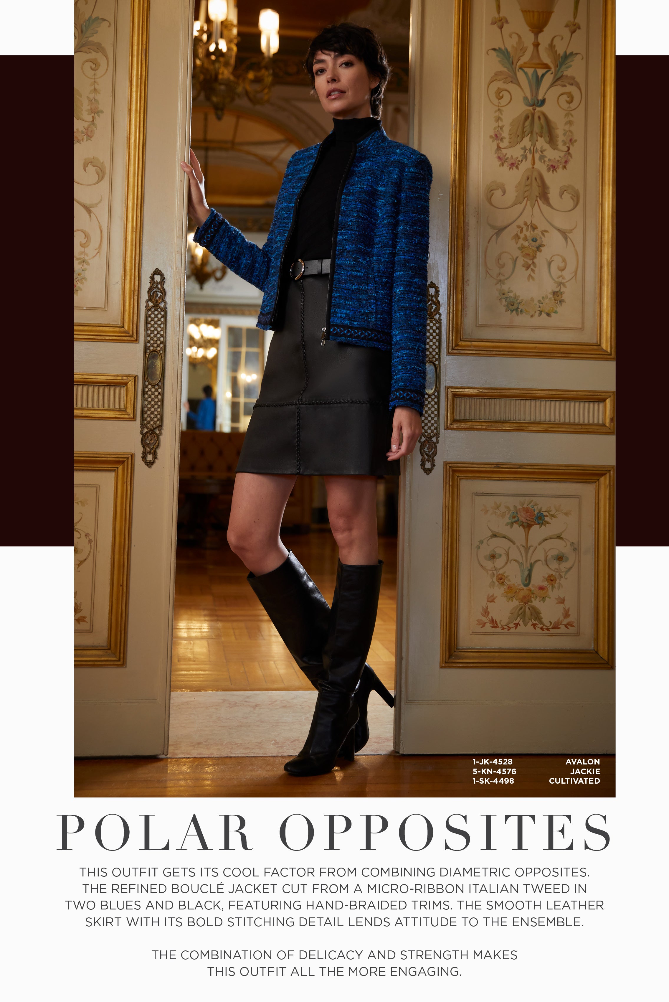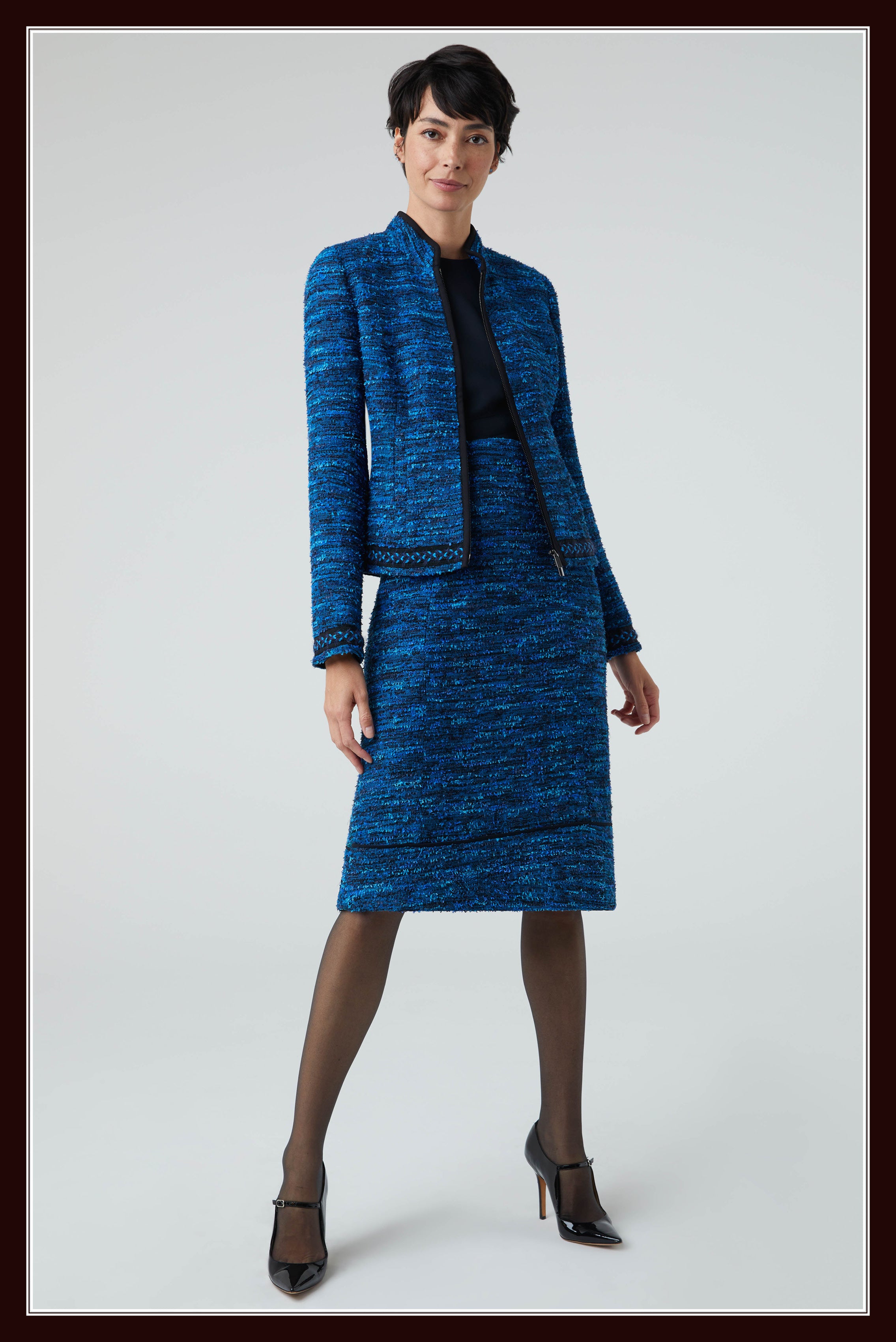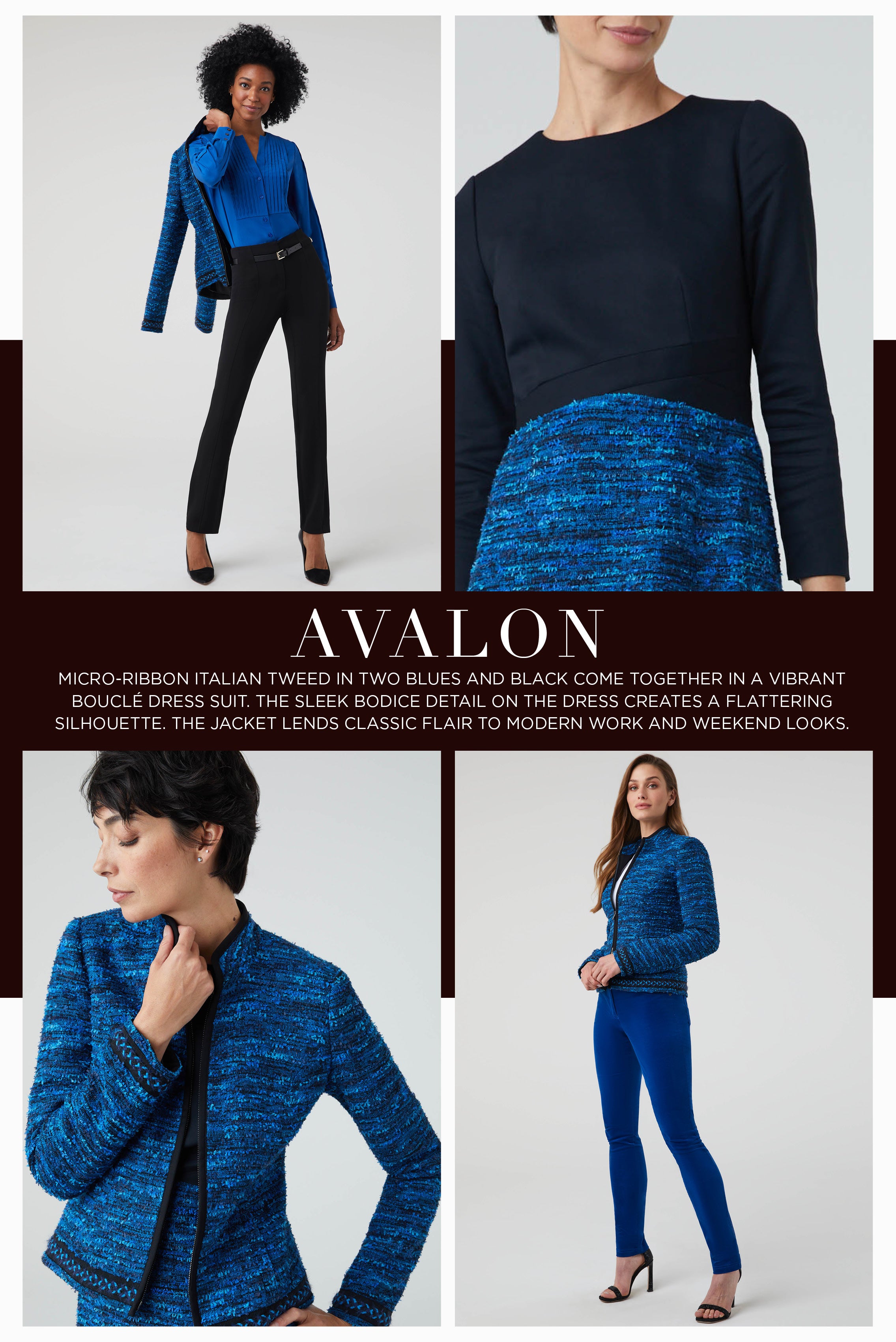 We love a bold tweed jacket — and this bouclé jacket delivers. featuring a micro-ribbon Italian tweed in two blues and black, the hand-braided trims deliver cool framing. pair with the coordinating dress for a sophisticated suiting look. or leverage the dynamism of the jacket when you style it with velvet jeans, a statement leather skirt, or sleek black pants.