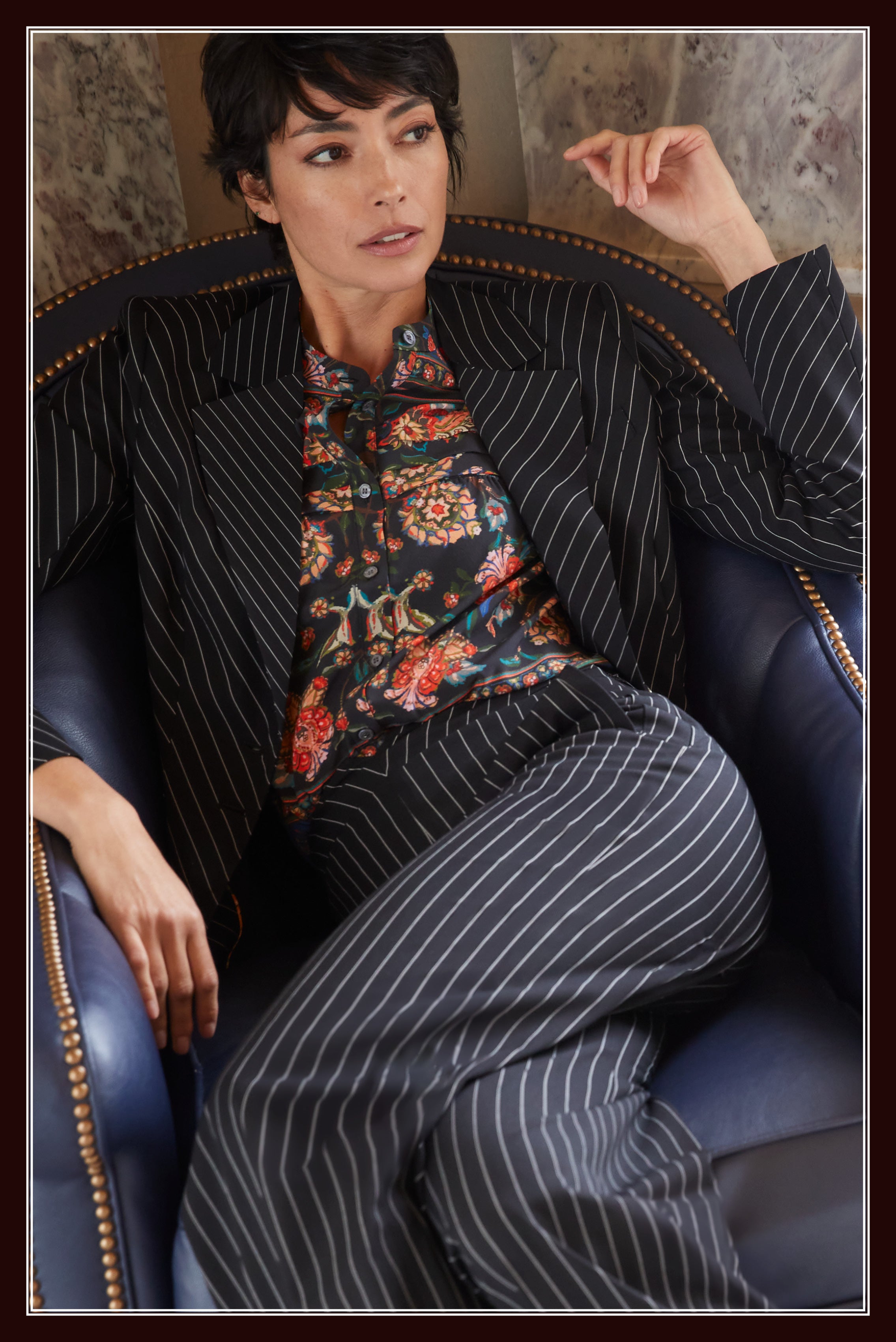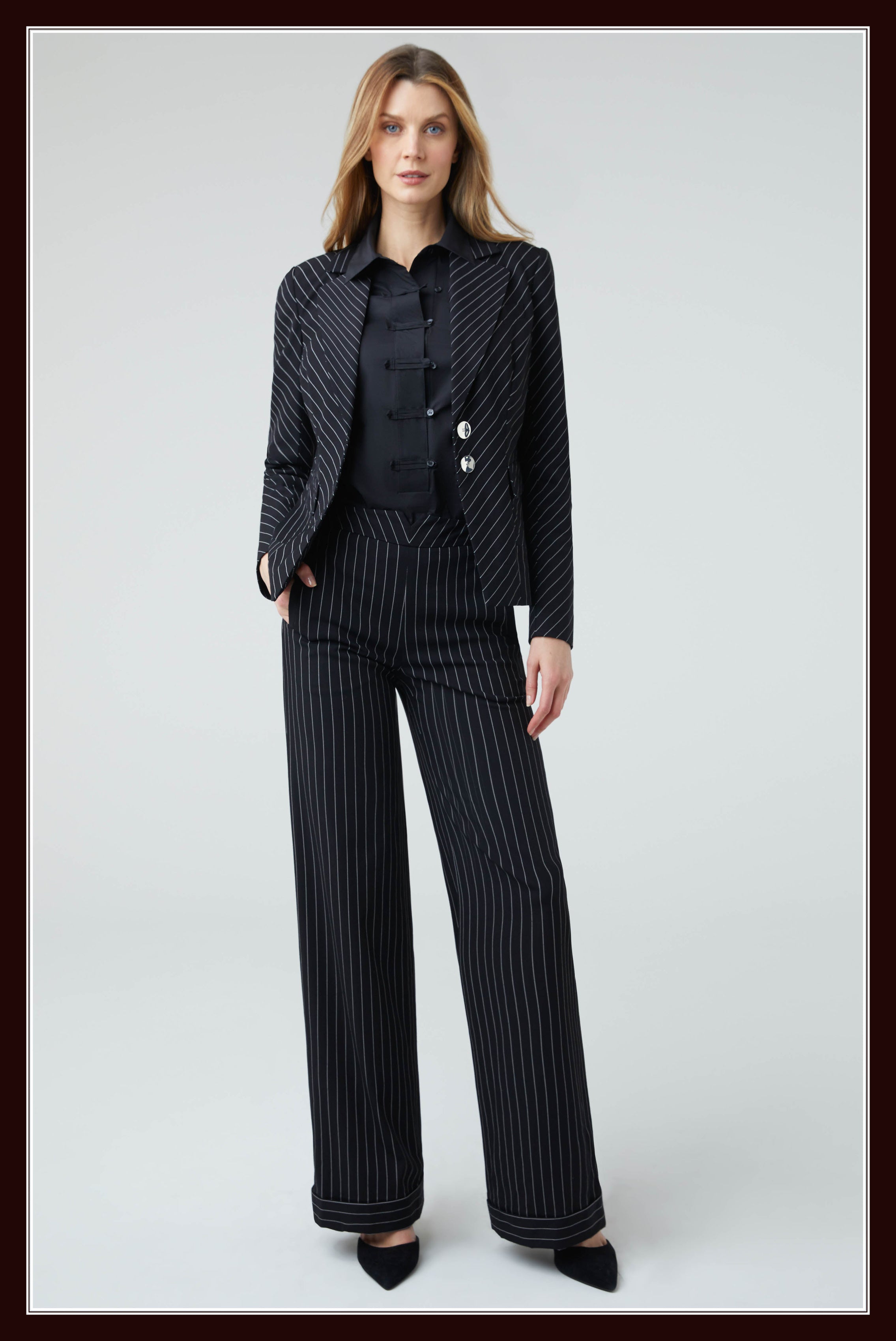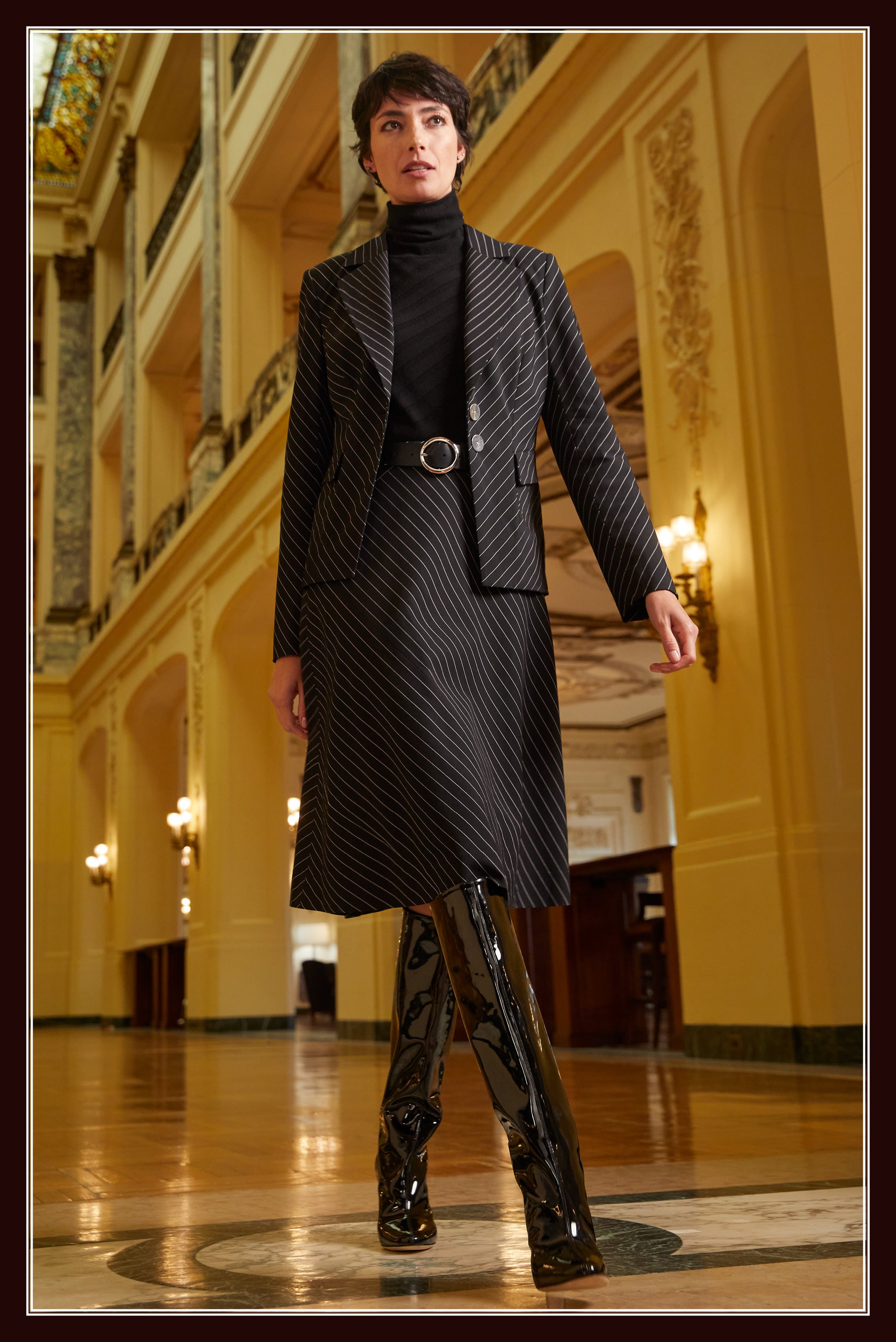 We love a bold tweed jacket — and this bouclé jacket delivers. featuring a micro-ribbon Italian tweed in two blues and black, the hand-braided trims deliver cool framing. pair with the coordinating dress for a sophisticated suiting look. or leverage the dynamism of the jacket when you style it with velvet jeans, a statement leather skirt, or sleek black pants.