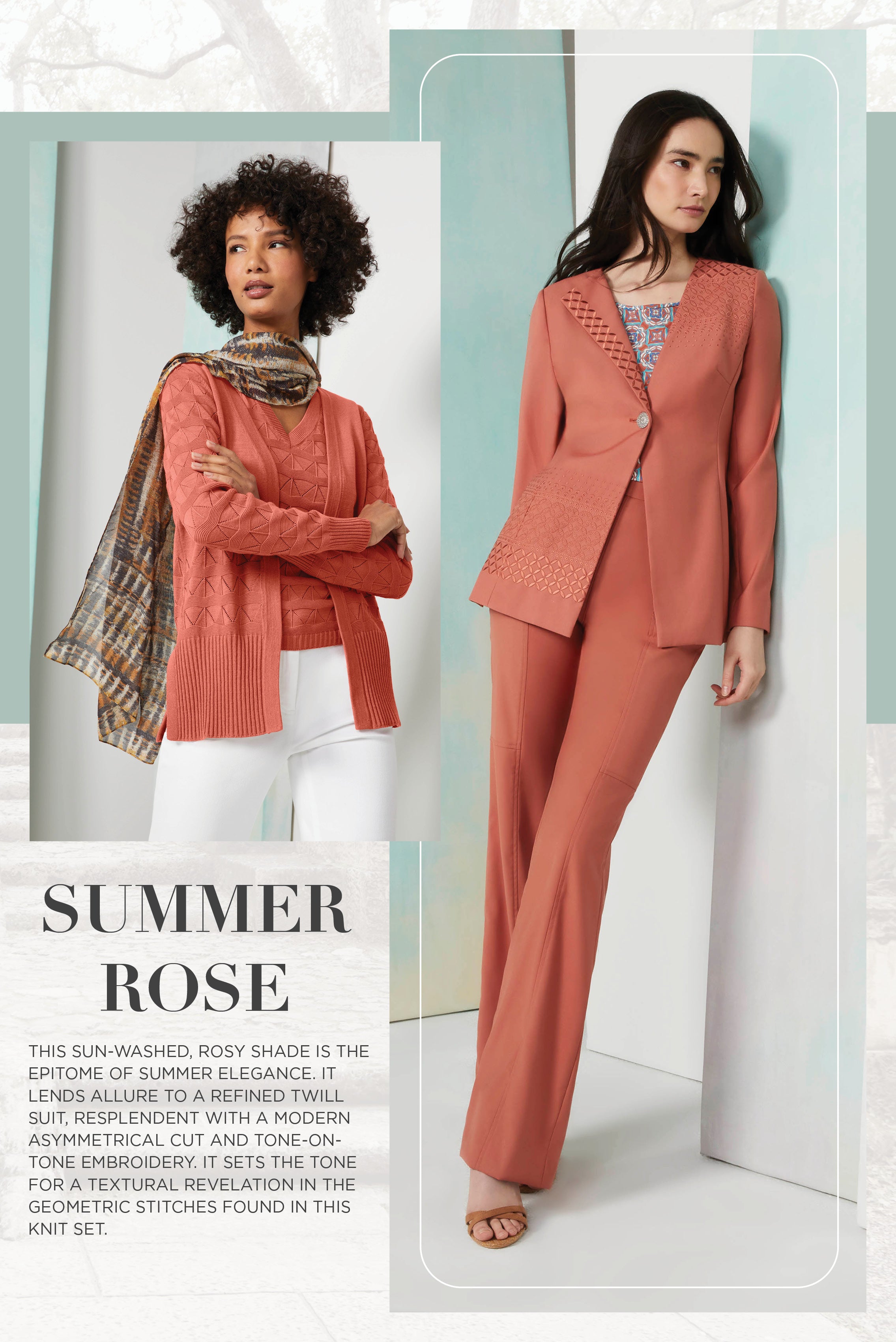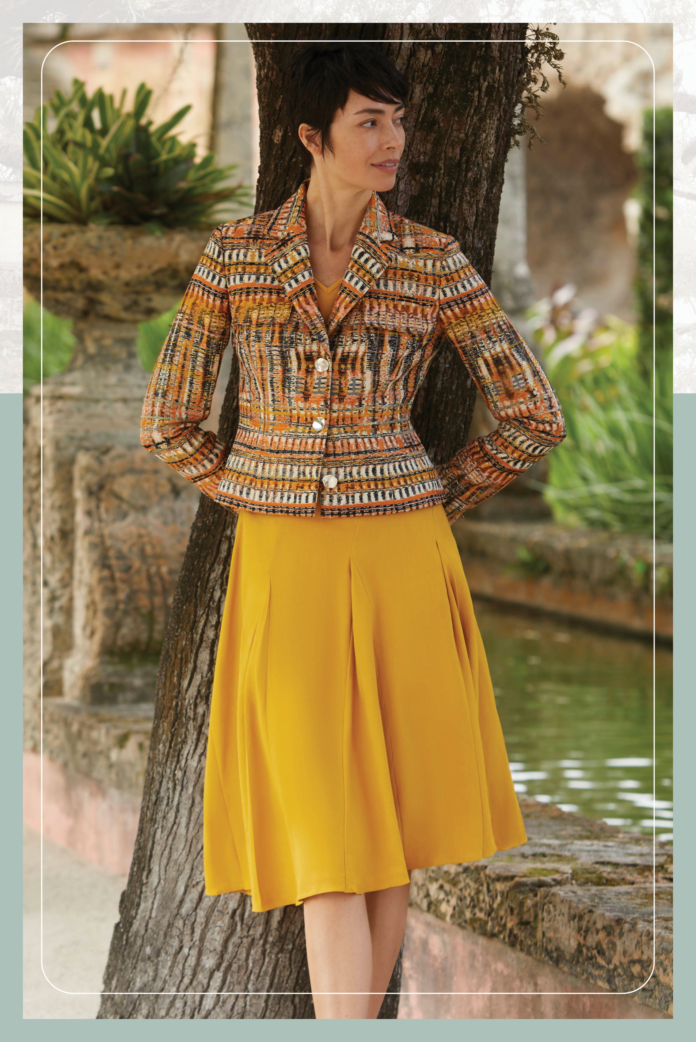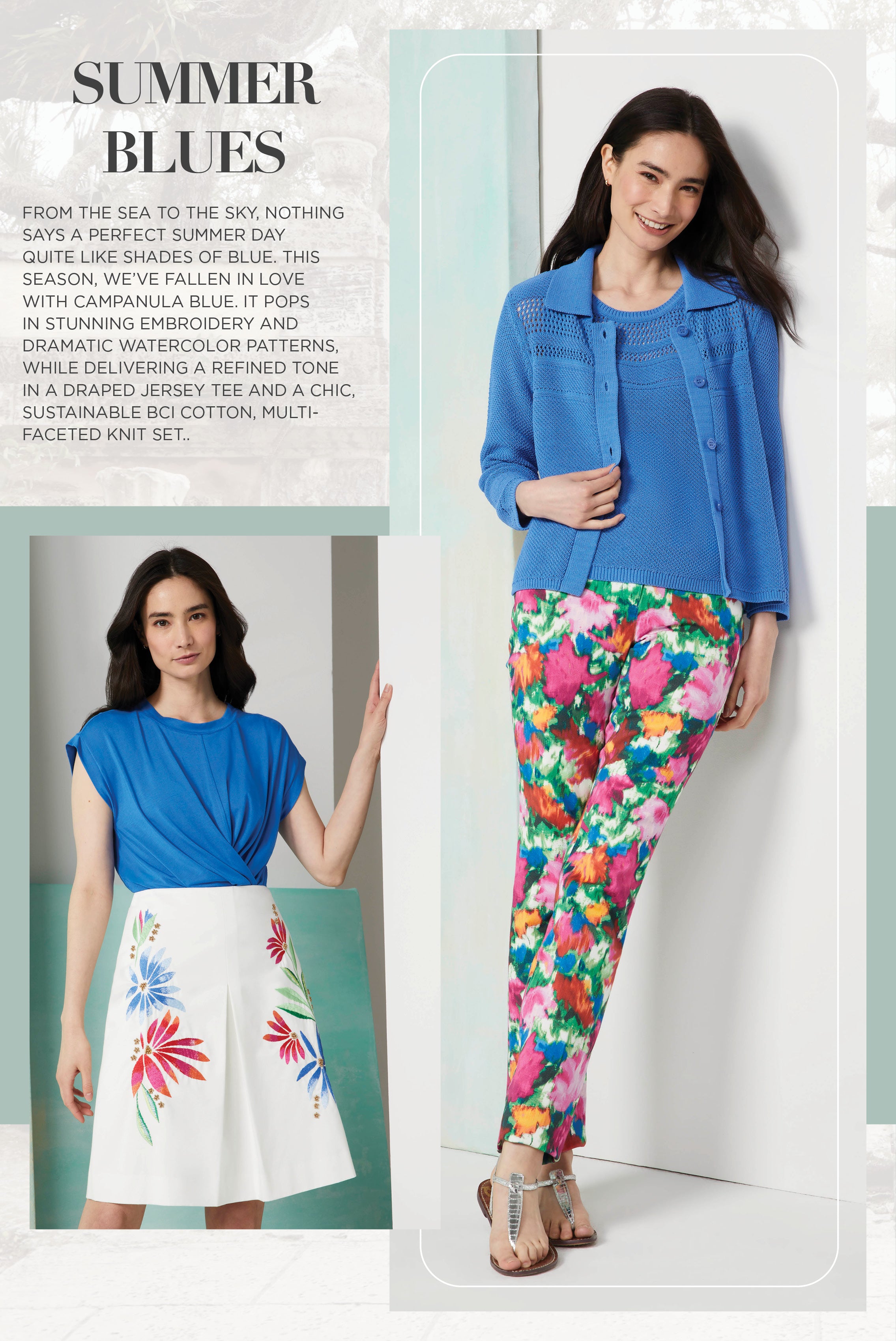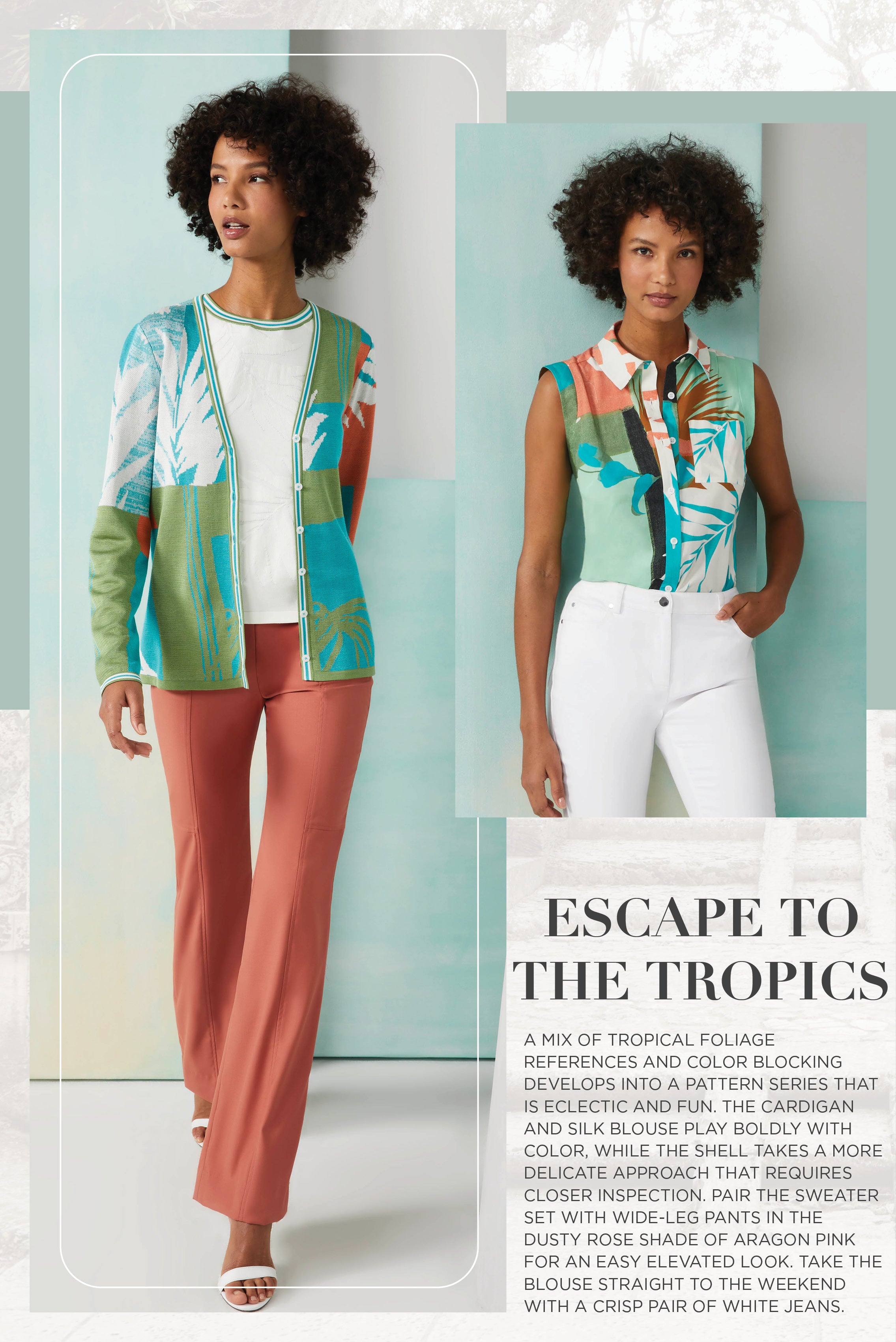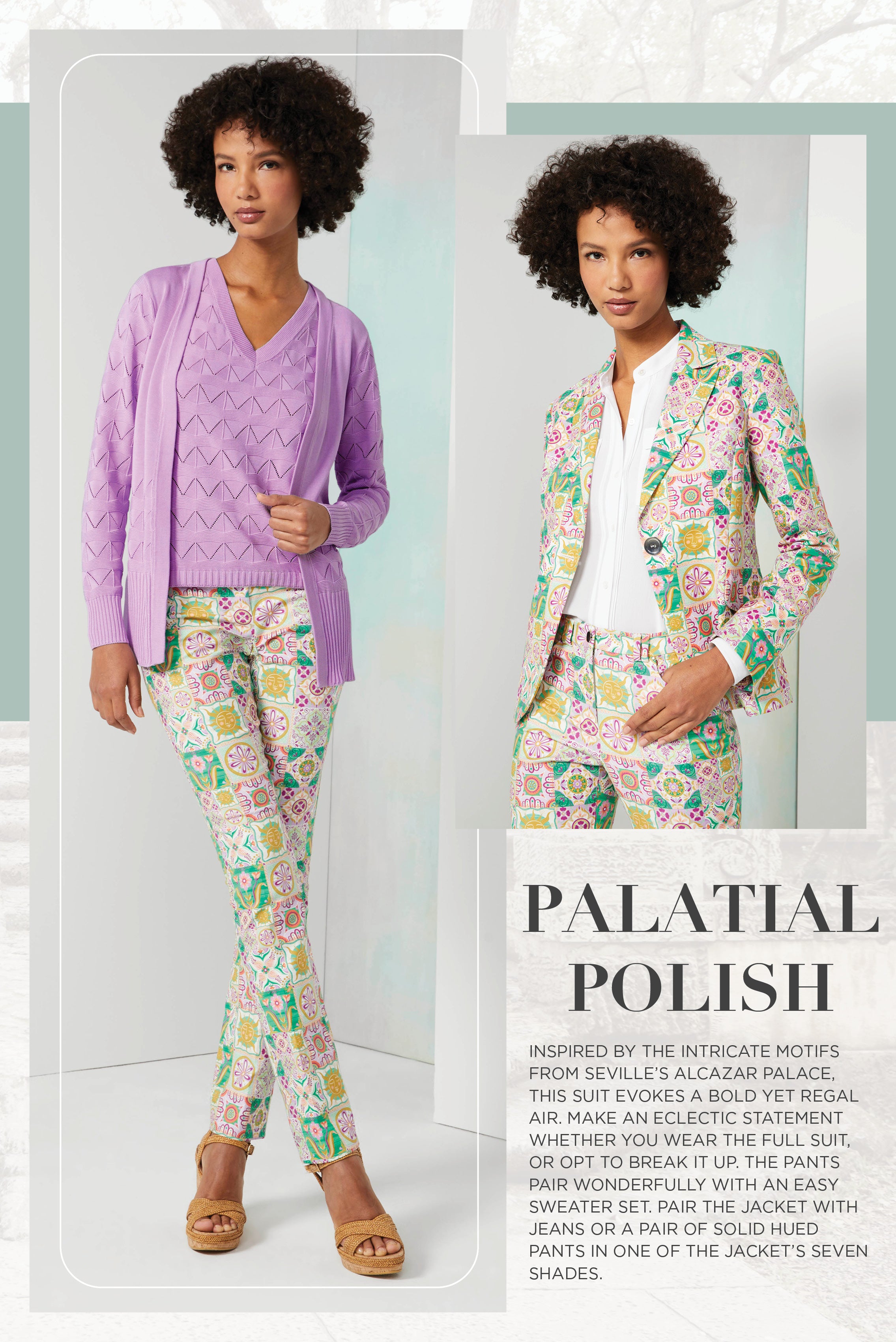 Discover the allure of Andalusia with our Chic Summer Tapestry collection, inspired by the opulent beauty of Southern Spain. Majestic prints and intricate knits evoke the vibrant hues and lush landscapes of the region's historic gardens, offering a luxurious summer wardrobe filled with tropical enchantment.