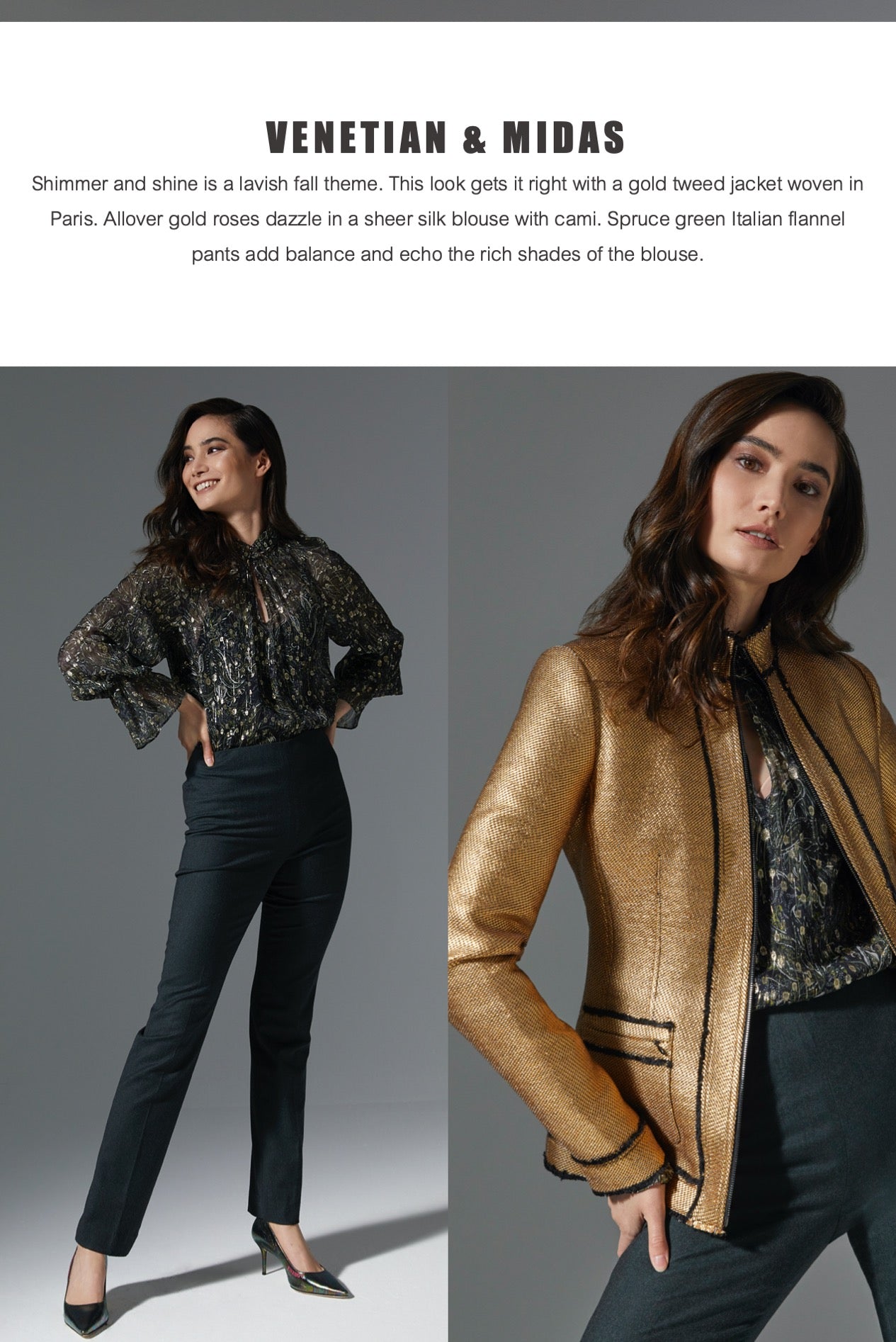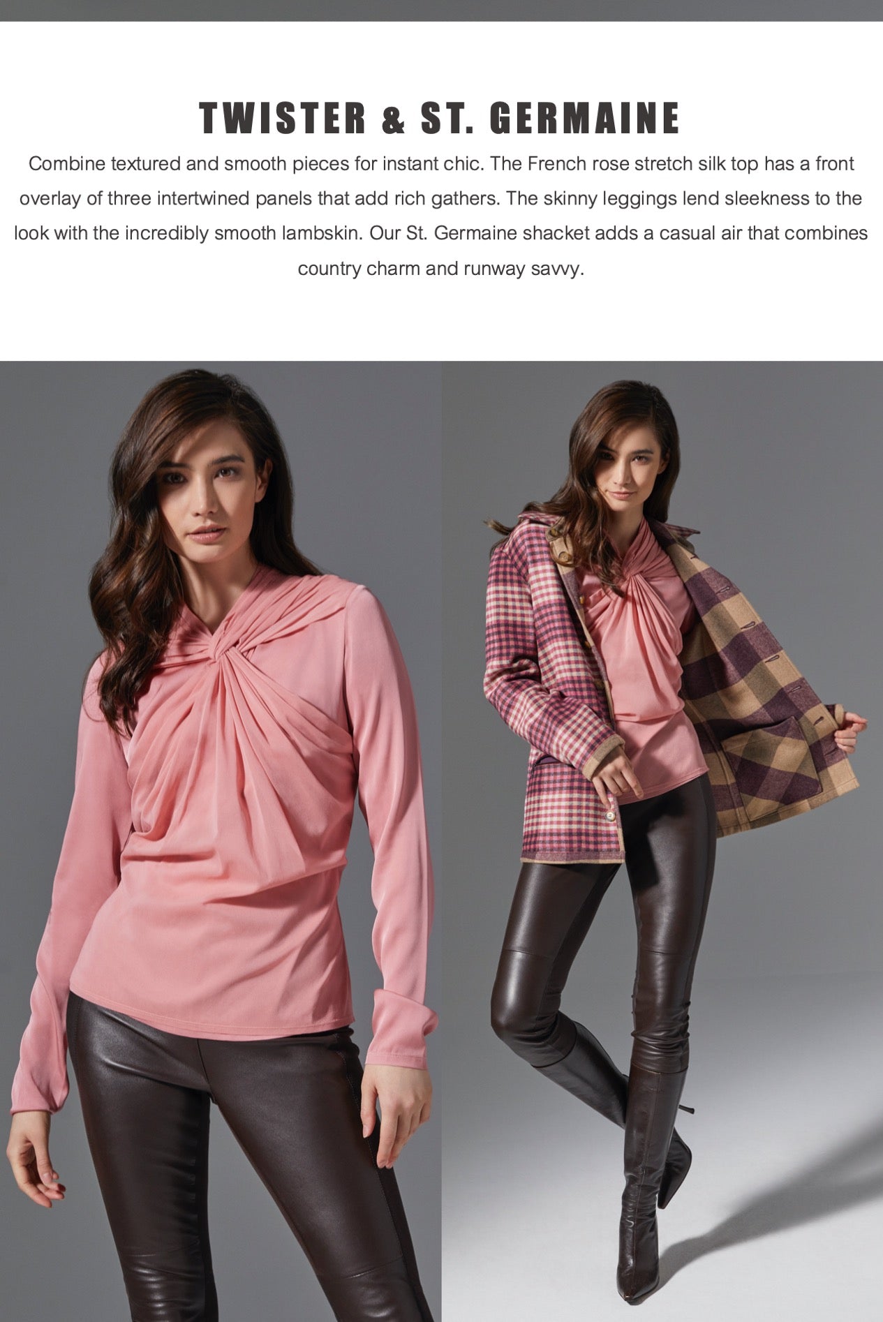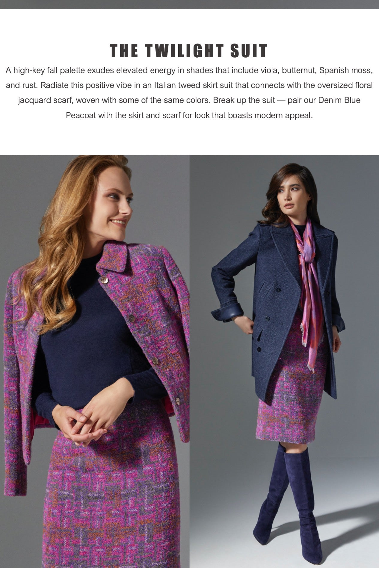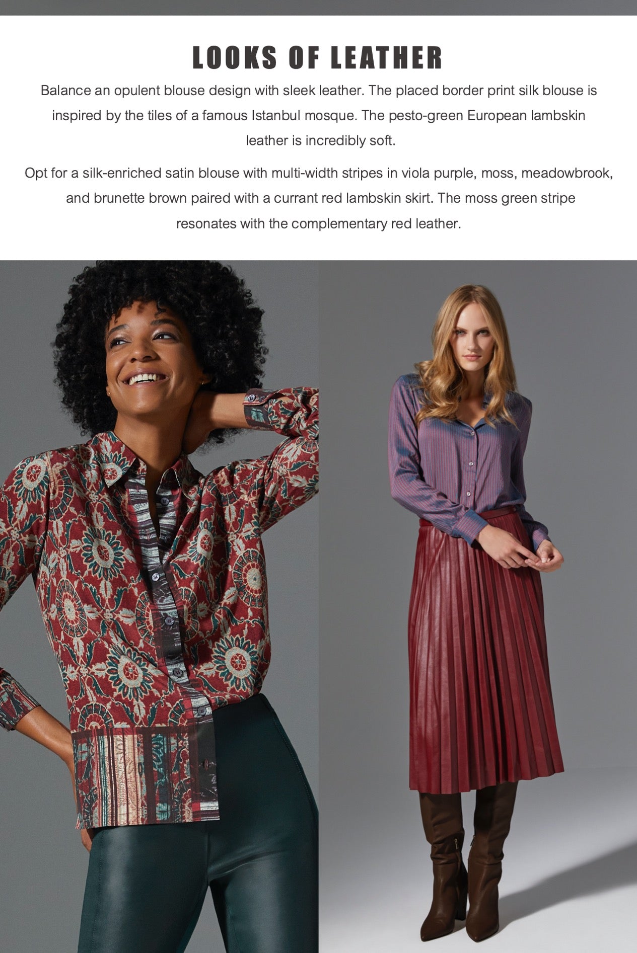 Build a fall wardrobe with intellectual appeal. Pants and knit tops in the finest materials assemble in layers of luxury. Ultra-soft Lambskin leather meets opulent printed silks and incomparable French tweed. This season is resplendent in rich texture and color. Spruce green and currant red are exciting, especially when paired together.
