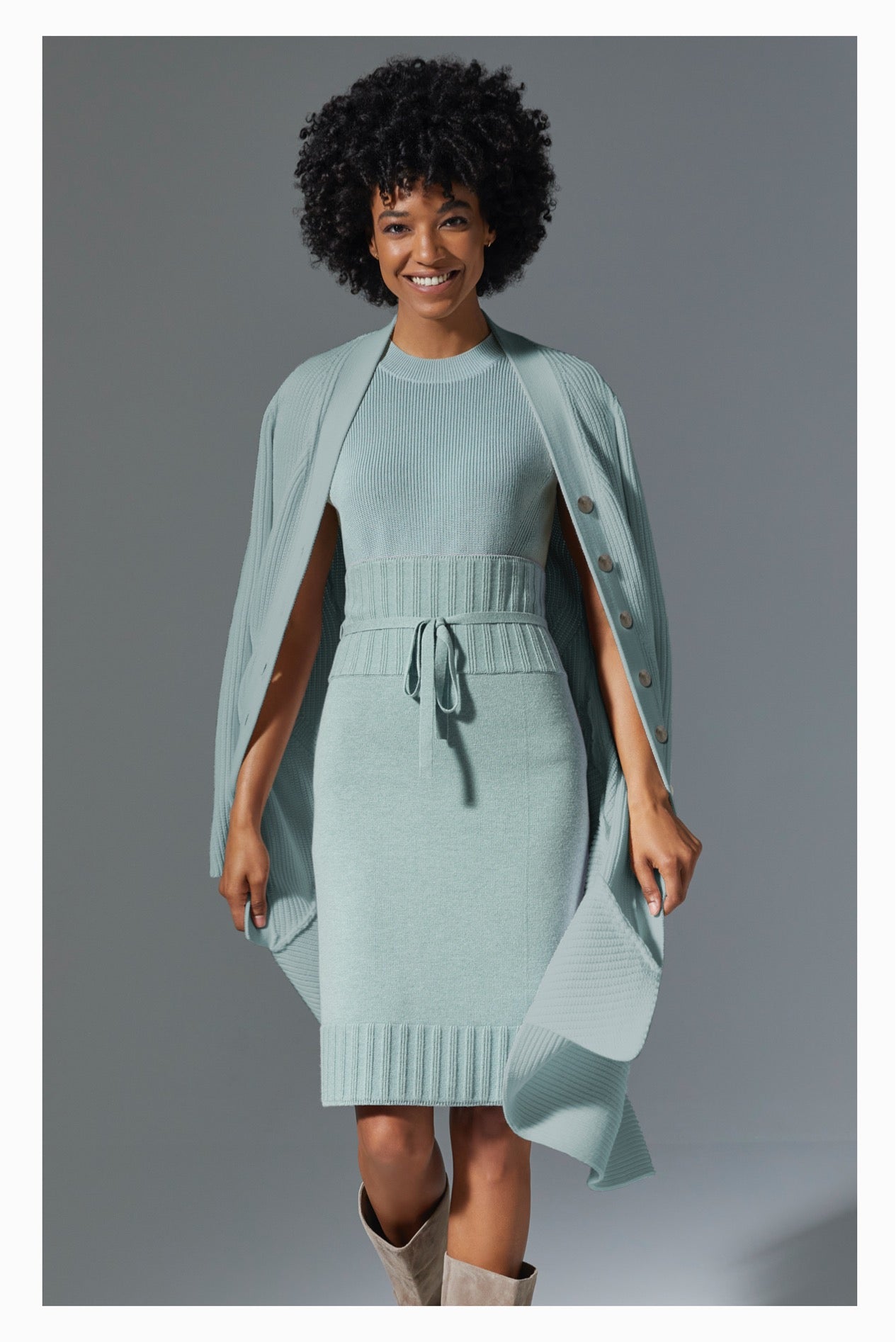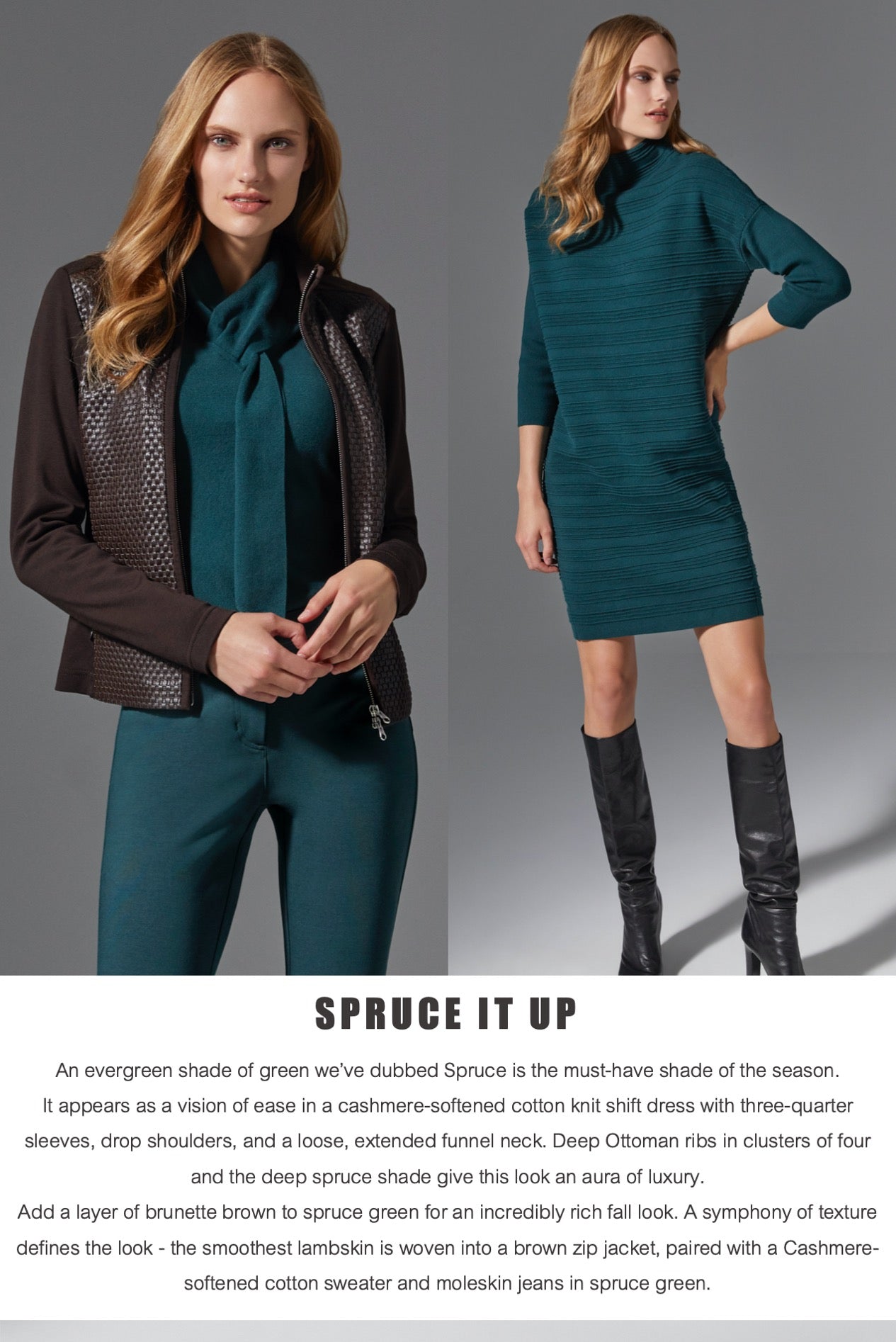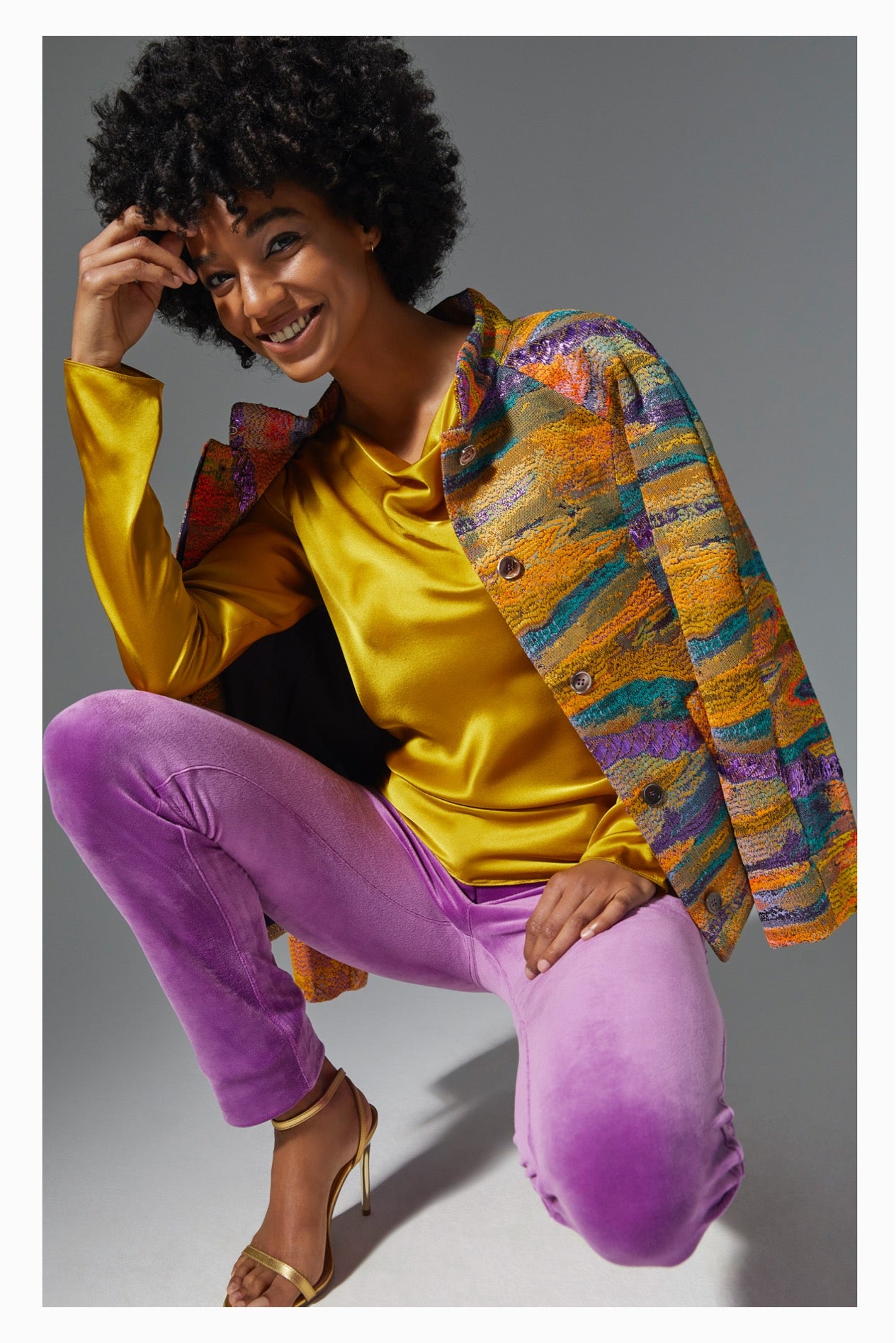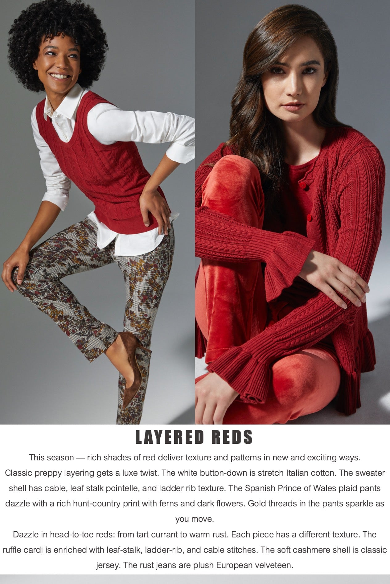 Build a fall wardrobe with intellectual appeal. Pants and knit tops in the finest materials assemble in layers of luxury. Ultra-soft Lambskin leather meets opulent printed silks and incomparable French tweed. This season is resplendent in rich texture and color. Spruce green and currant red are exciting, especially when paired together.