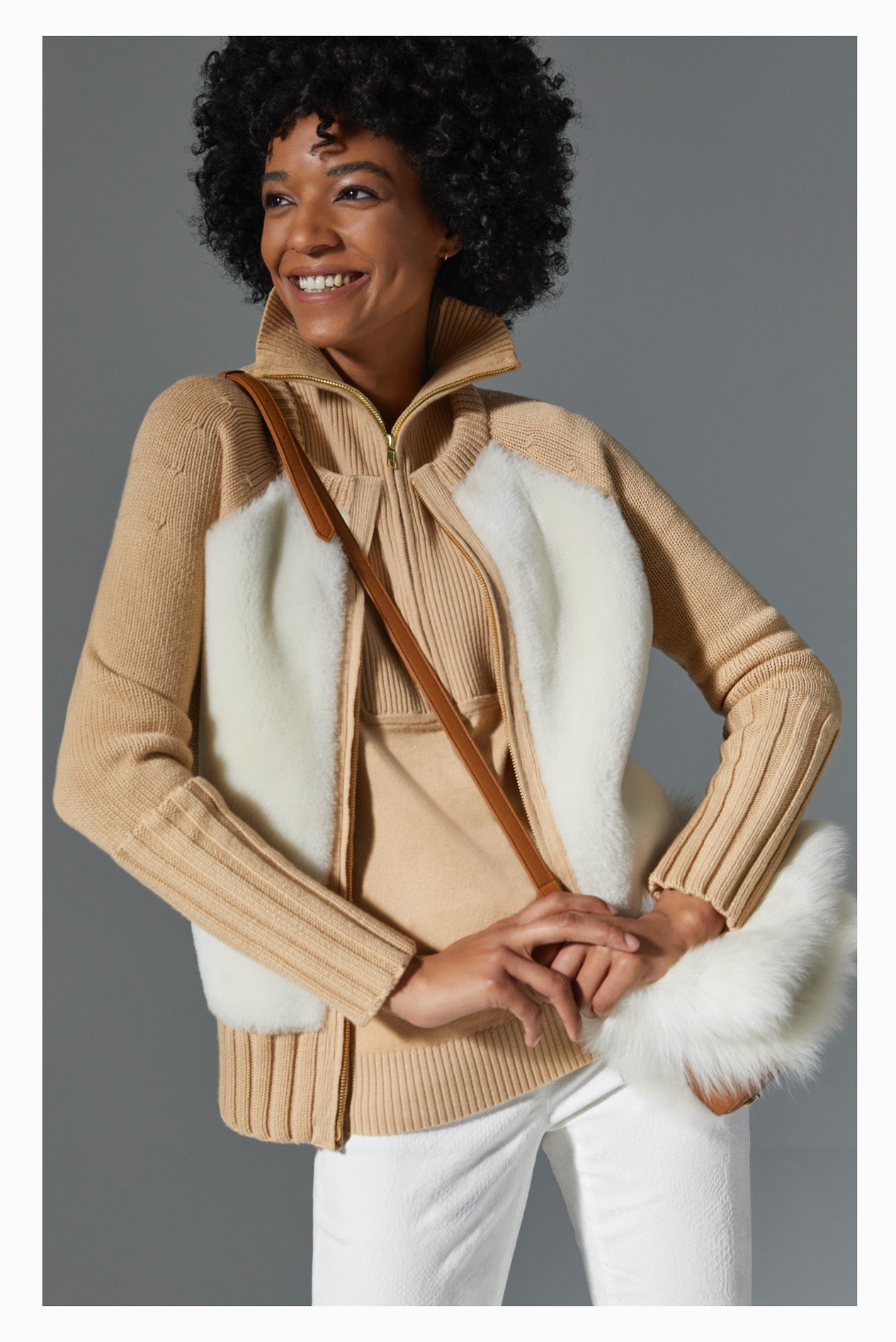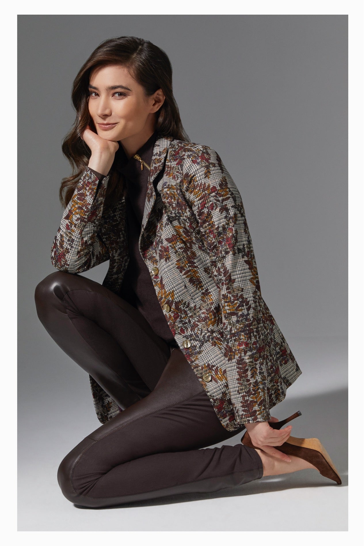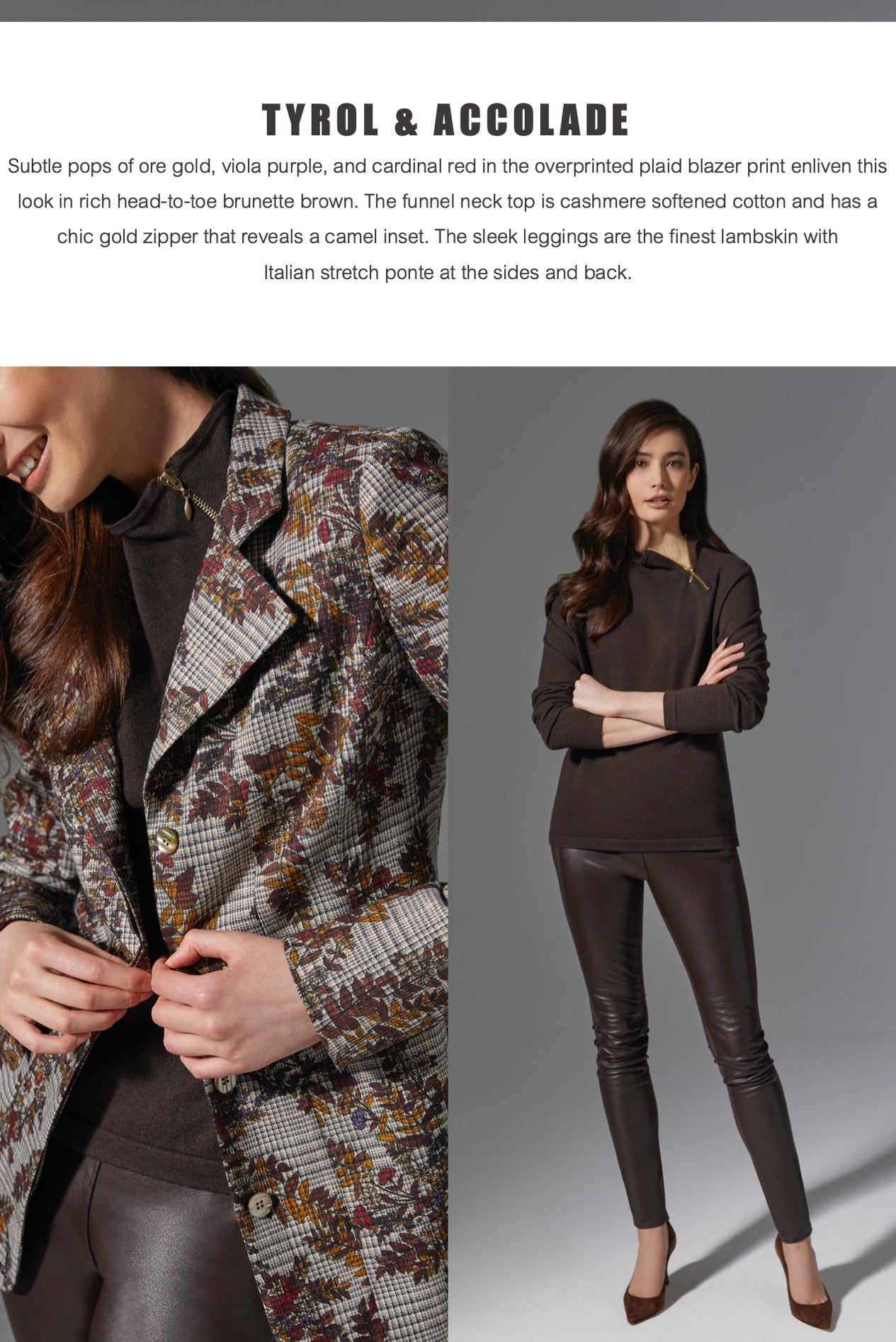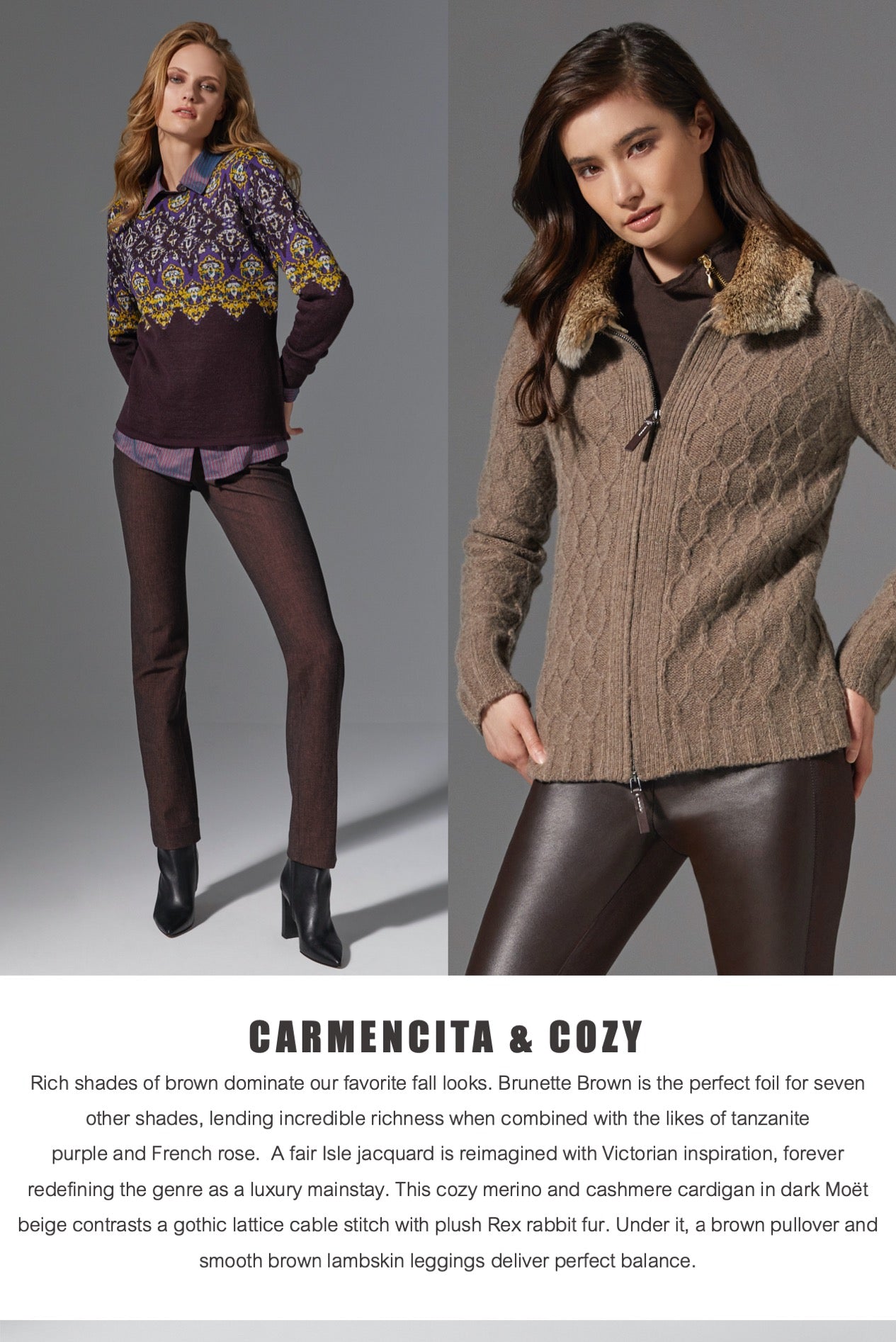 Dress for comfort in layers with special flair. Each piece deserves its time in the spotlight in sophisticated ensembles. An unexpected foliage print is layered over a classic plaid from Spain in special fall suiting Leather-front leggings add a luxe touch to every fall look they appear in. Rabbit fur and gothic lattice cable knit come together in a special sweater jacket. A lambskin jacket features a basket weave that is as complex as the “Cubist” scarf accessory.