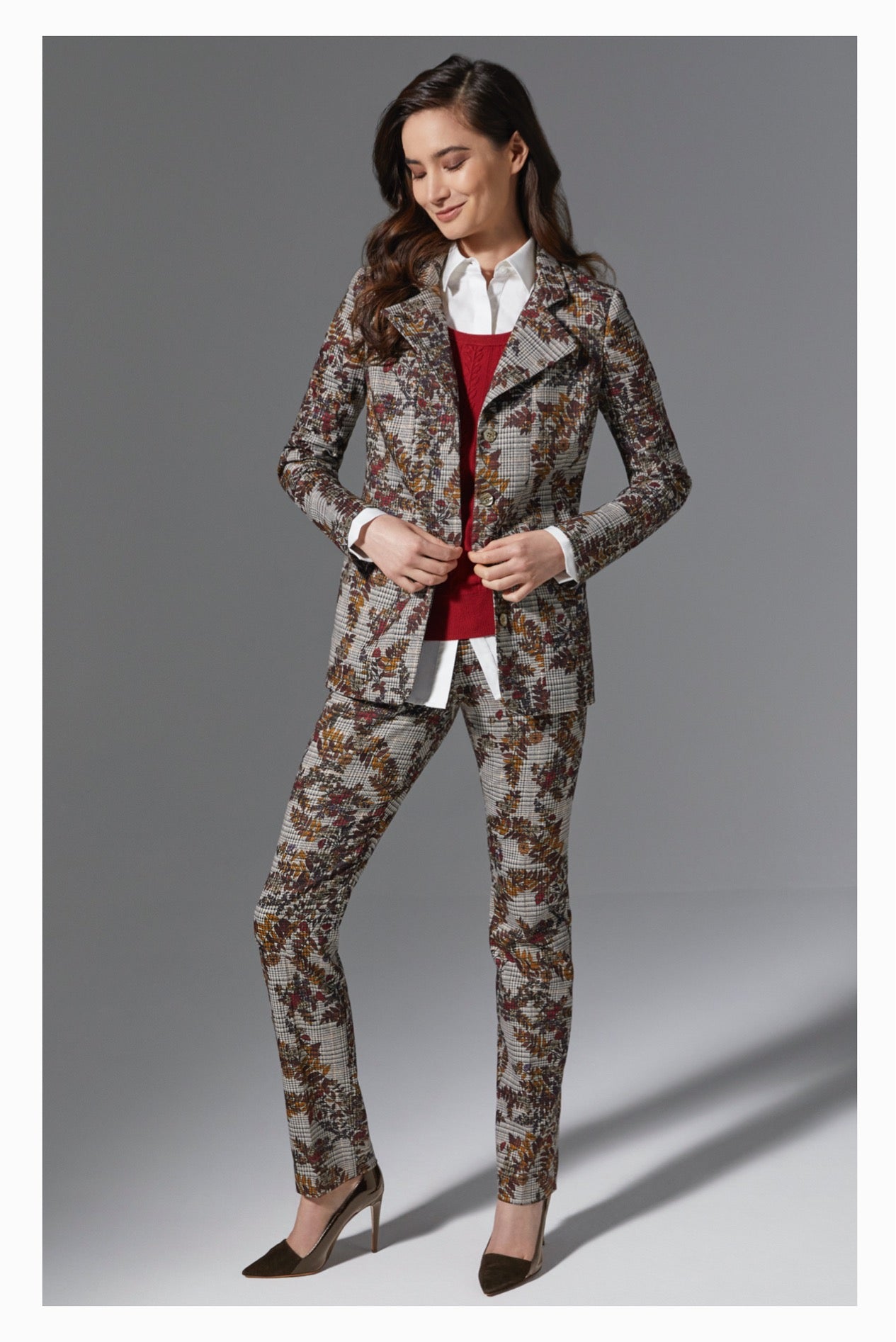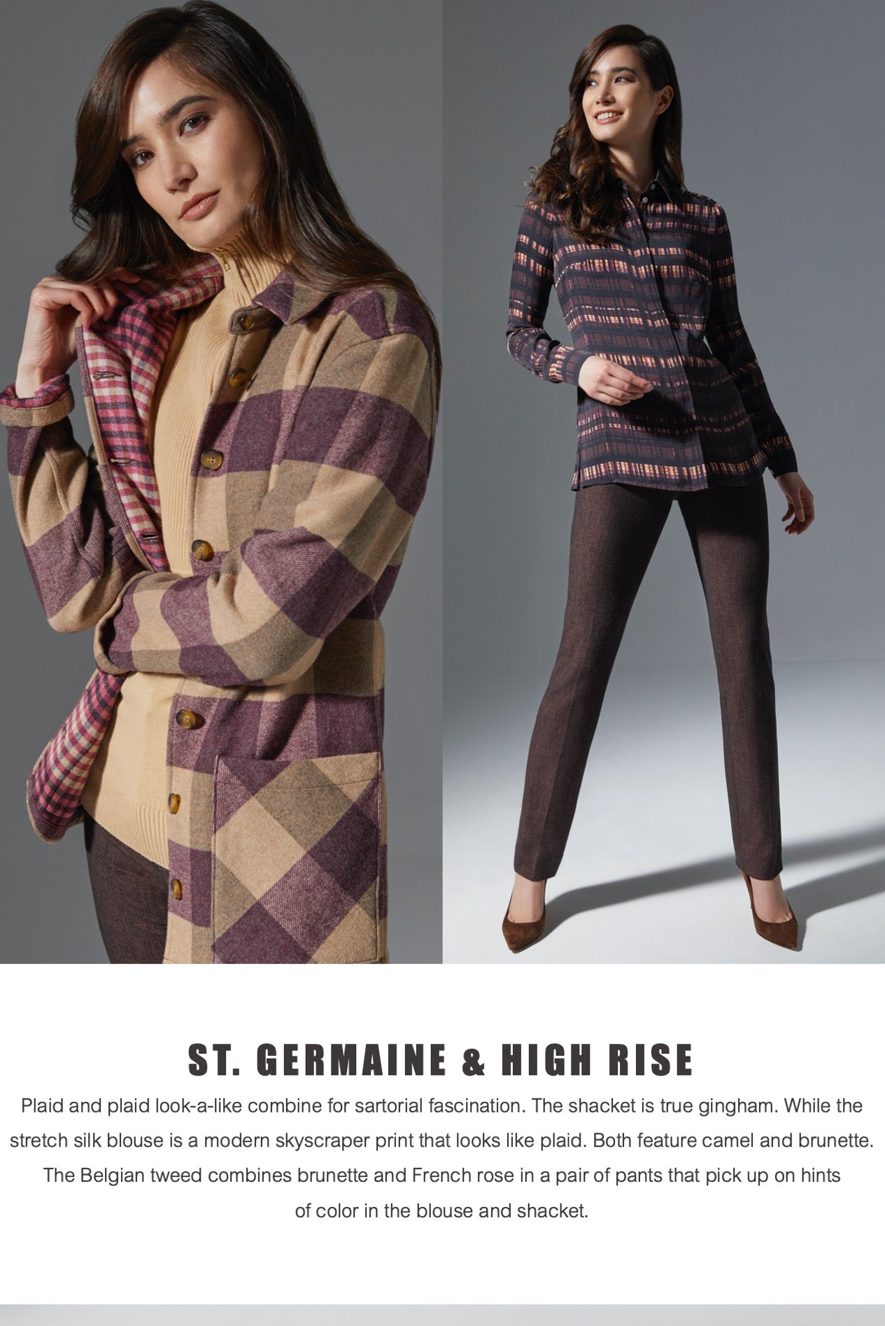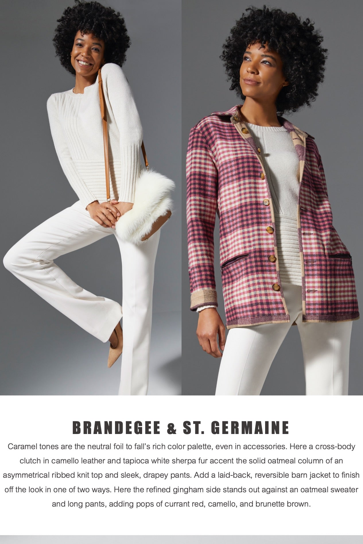 Country chic brings unexpected affluence. Shades of cardamom, French rose, brunette, currant, ivory, and camel come together in looks that redefine elegance. A flannel shacket reverses from windowpane plaid to gorgeous gingham. Plush touches of shearling up the ante on cozy cool with shades of camello, ivory, and winter white. A graphic skyscraper print blouse looks like plaid from a distance. Classic knit intarsia stripes layer over textured winter white stretch cotton jeans, though a closer viewing reveals rich python flocking.
