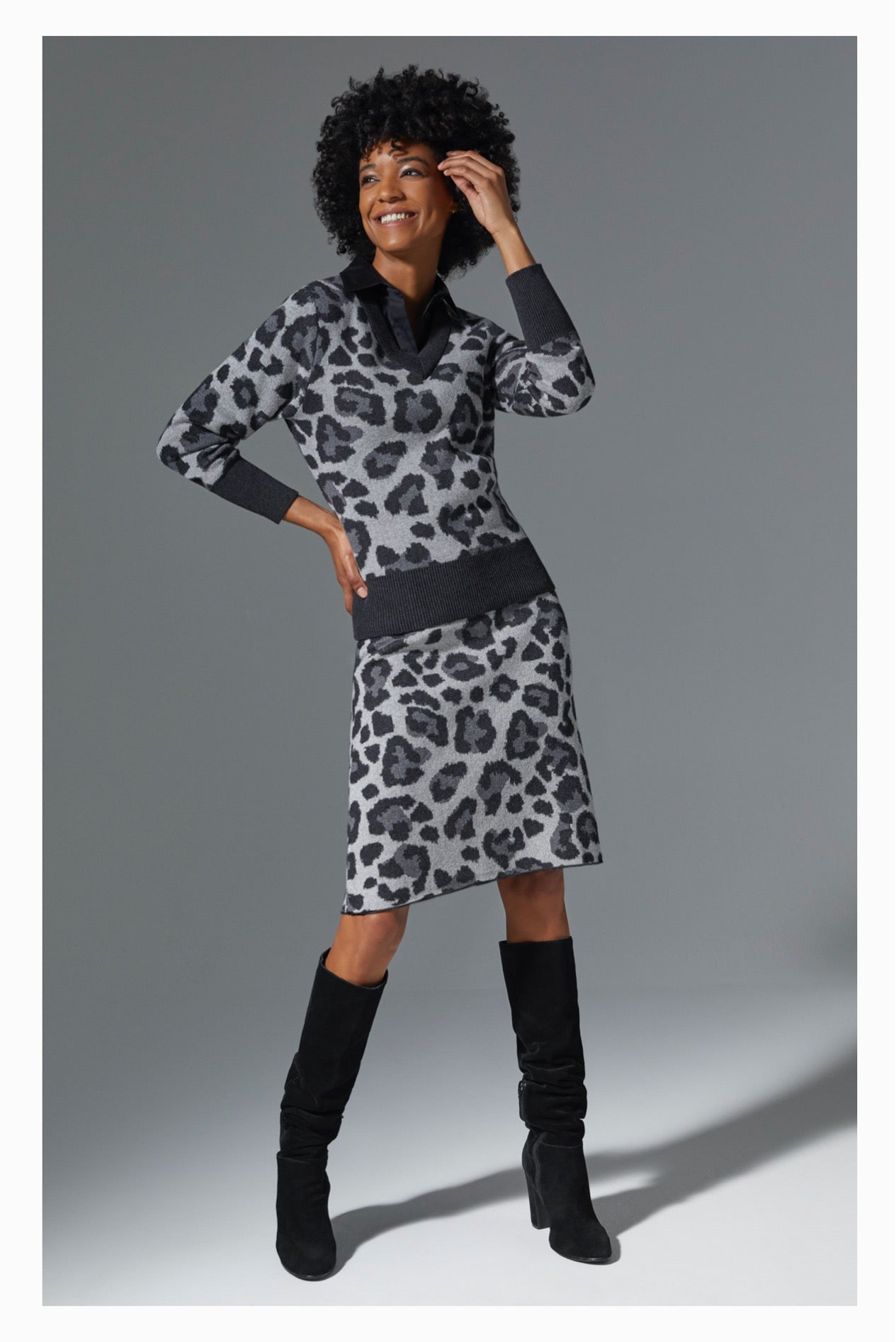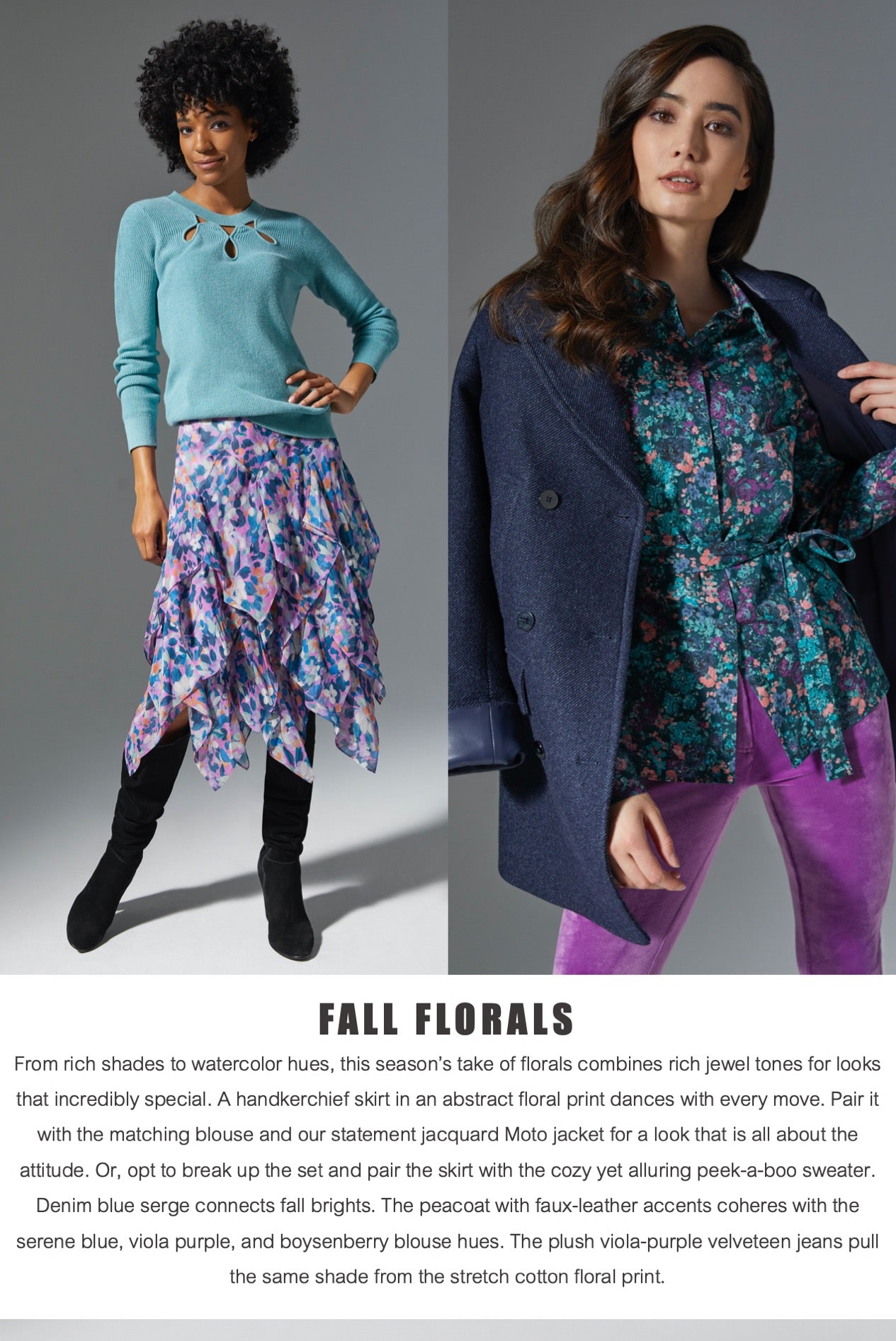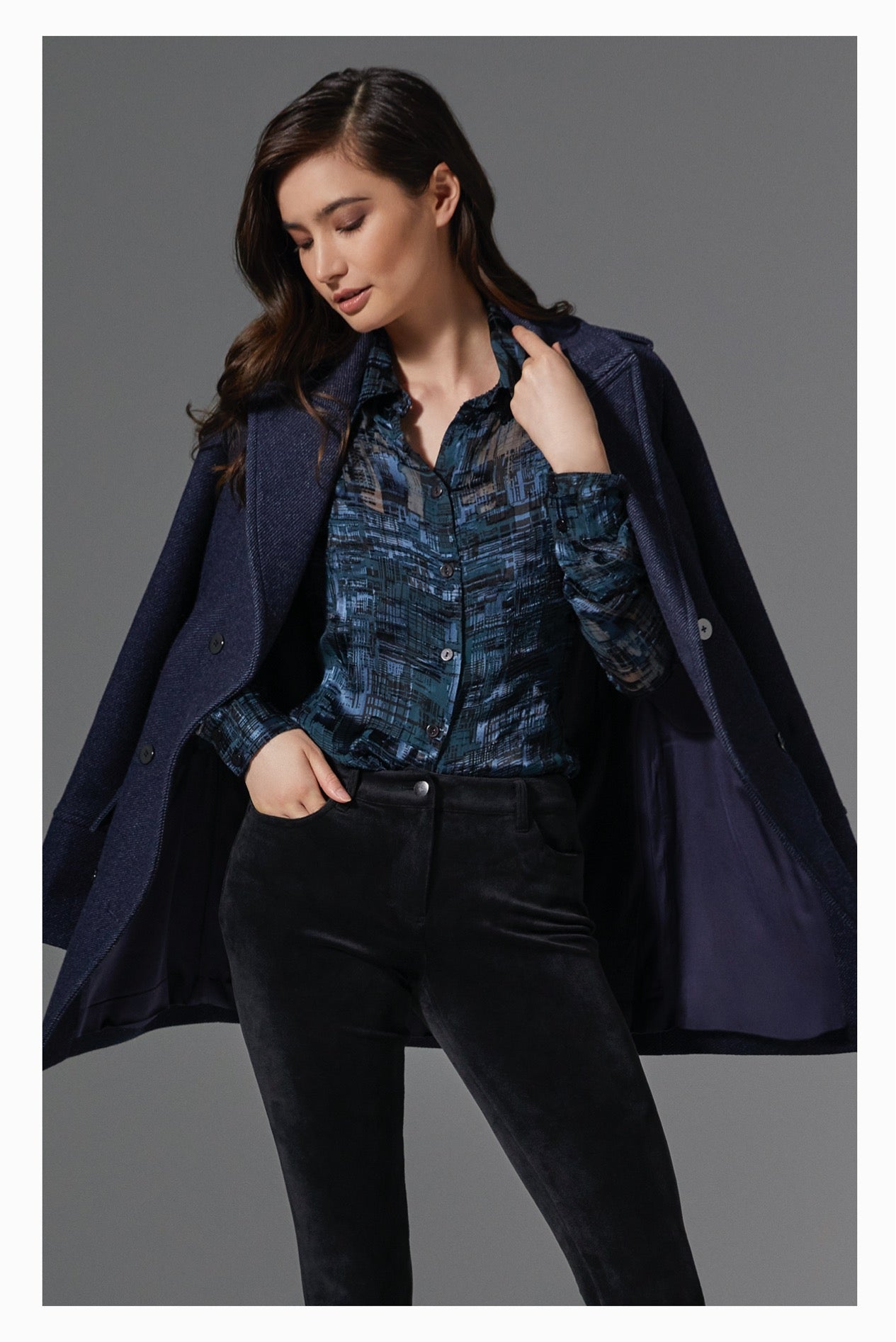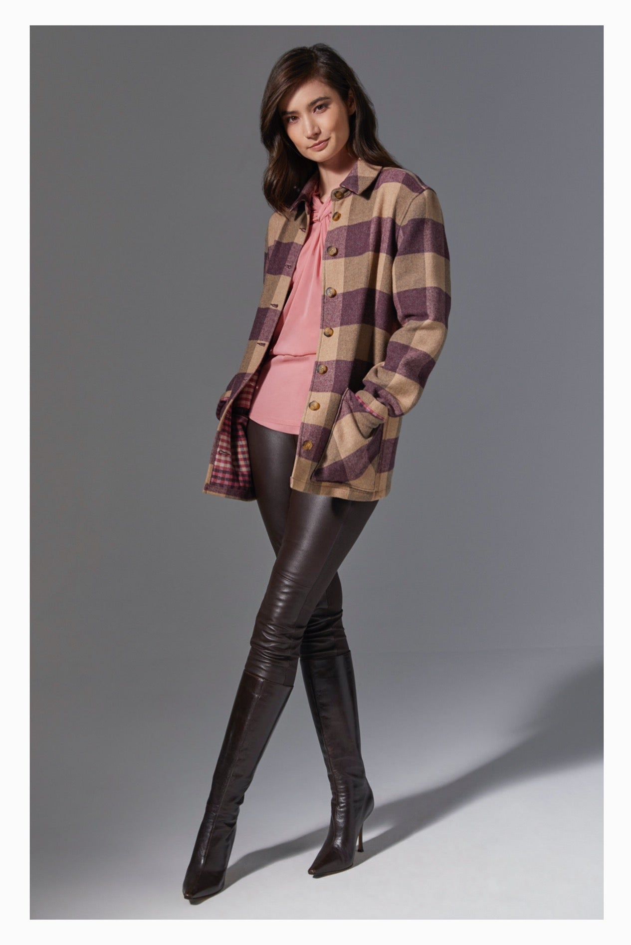 Country chic brings unexpected affluence. Shades of cardamom, French rose, brunette, currant, ivory, and camel come together in looks that redefine elegance. A flannel shacket reverses from windowpane plaid to gorgeous gingham. Plush touches of shearling up the ante on cozy cool with shades of camello, ivory, and winter white. A graphic skyscraper print blouse looks like plaid from a distance. Classic knit intarsia stripes layer over textured winter white stretch cotton jeans, though a closer viewing reveals rich python flocking.