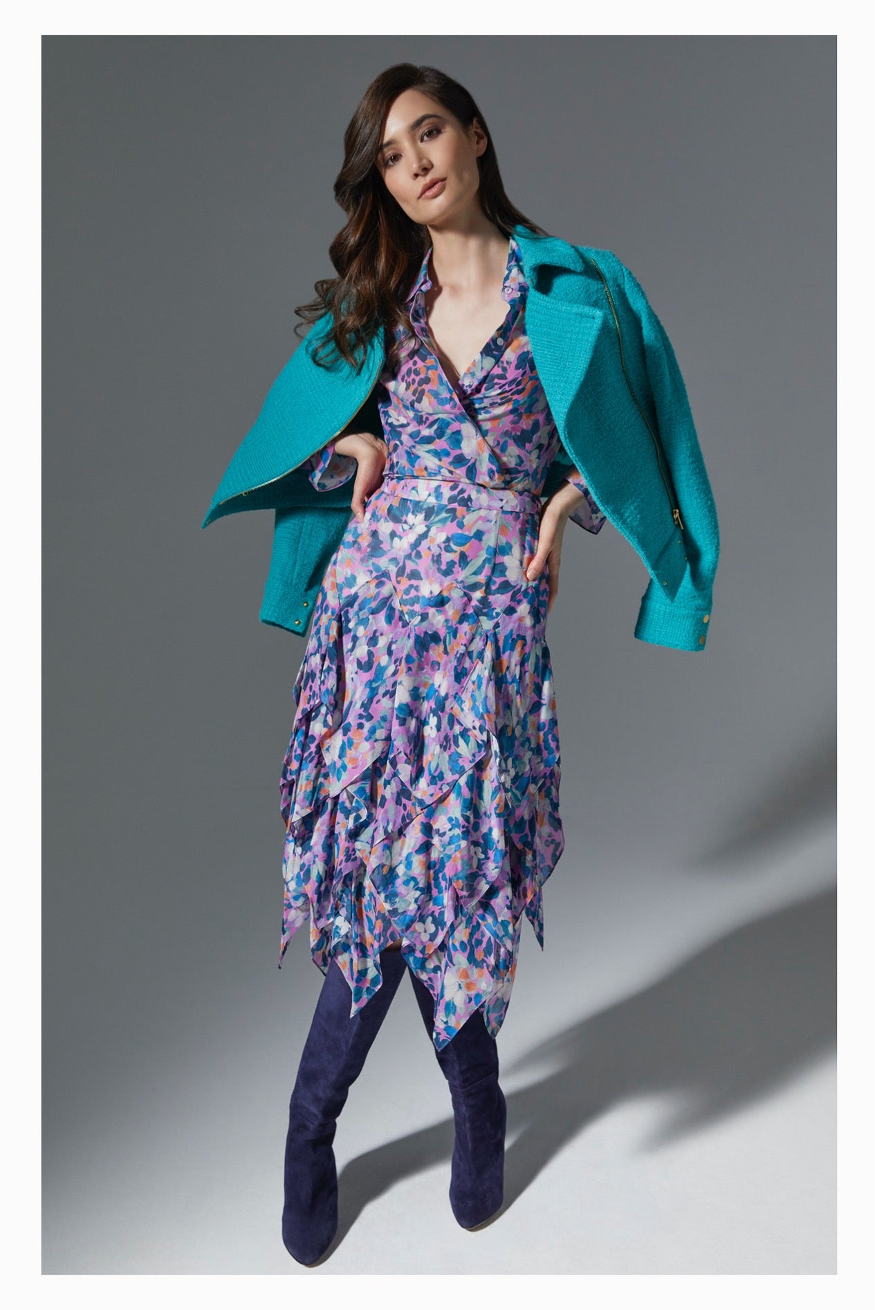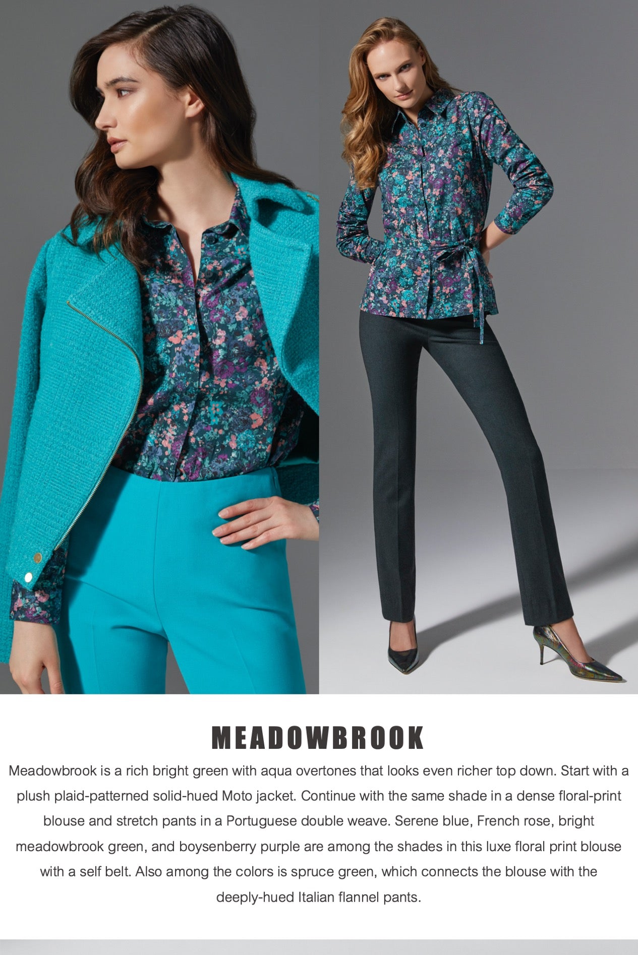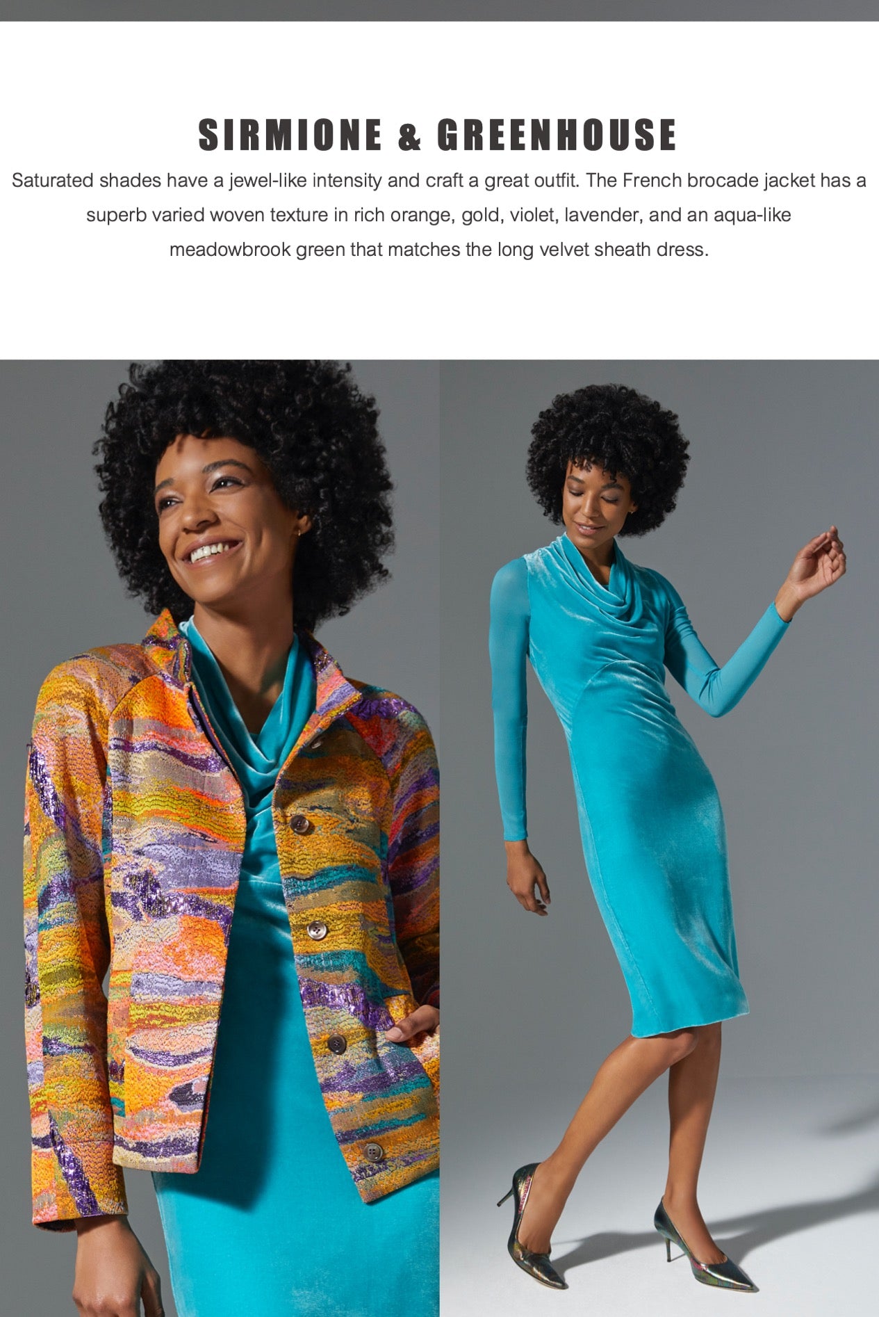 Welcome to the season of vivid color. Start with bright viola purple, appears throughout the collection in French brocade, Italian tweed, and Asian silk florals. Meadowbrook green has a confident posh overtone. Brassy gold, rust, and boysenberry purple complete a palette with brilliant panache.