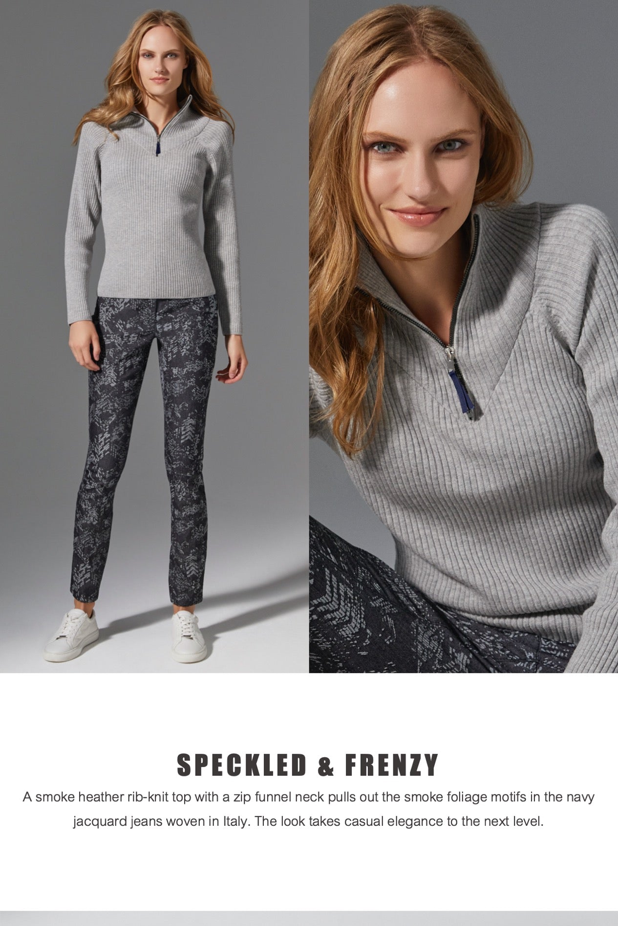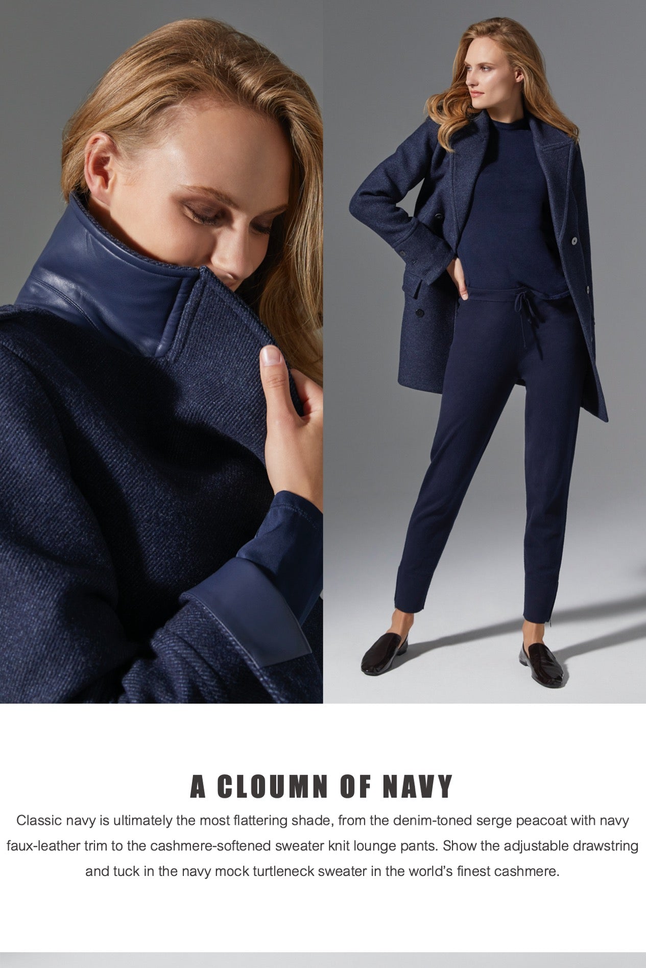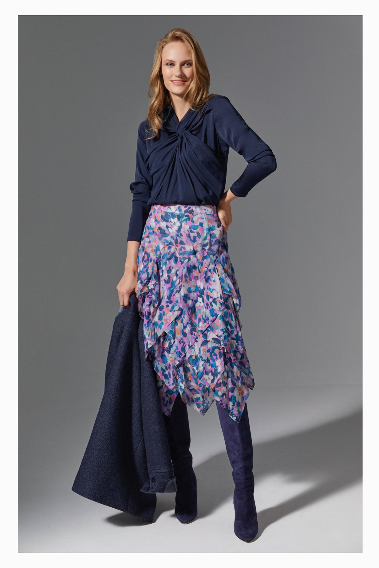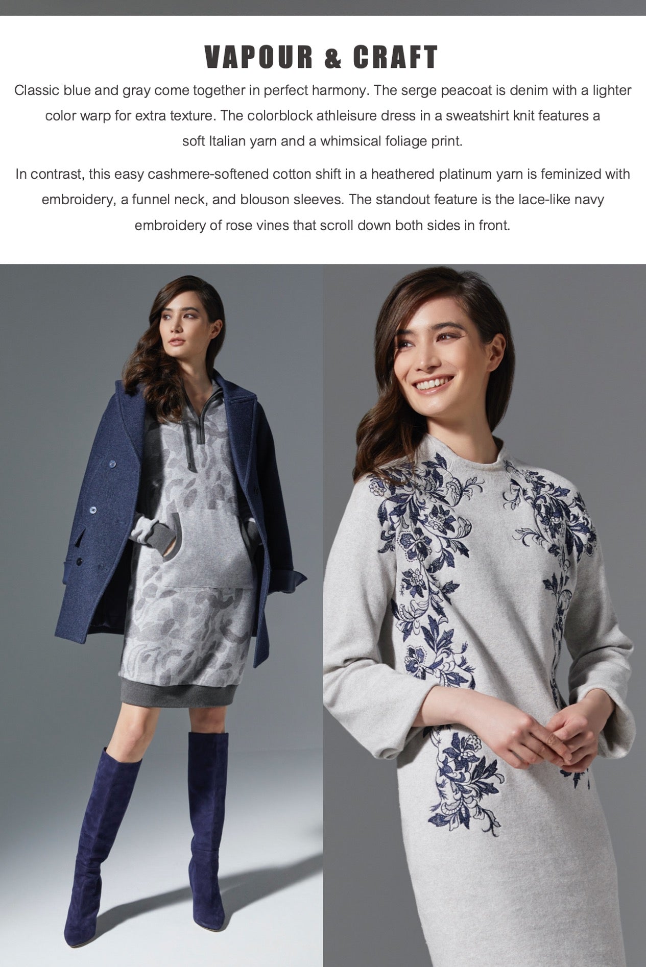 An abstract floral print silk skirt is grounded with a navy silk blouse and denim peacoat. Extravagant rose embroidery in navy elevates an easy platinum grey knit shift dress. It’s the common shade that carries over from an abstract fine-art Italian print hoodie to solid knit lounge pants, and marries Italian jacquard jeans to a solid cashmere sweater.