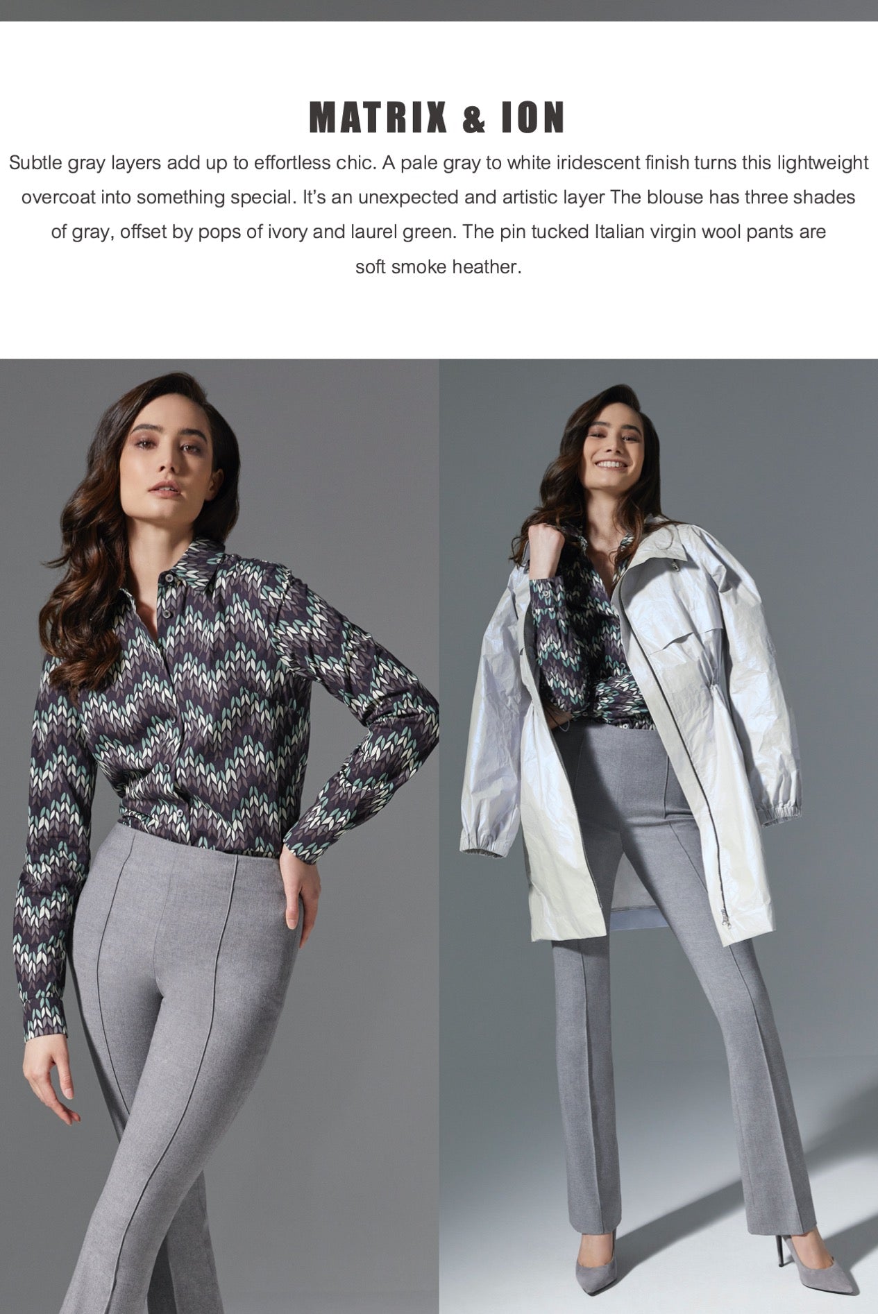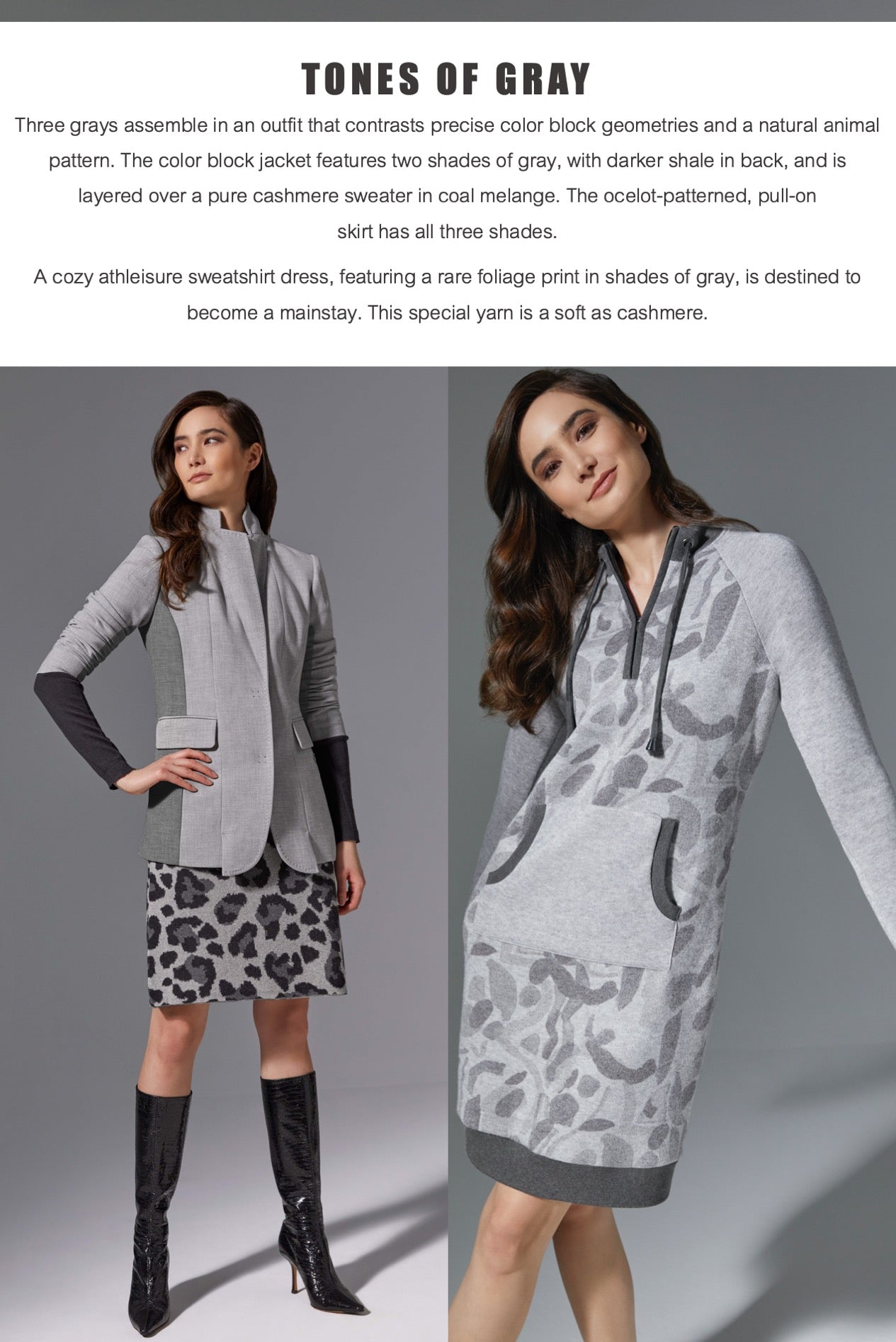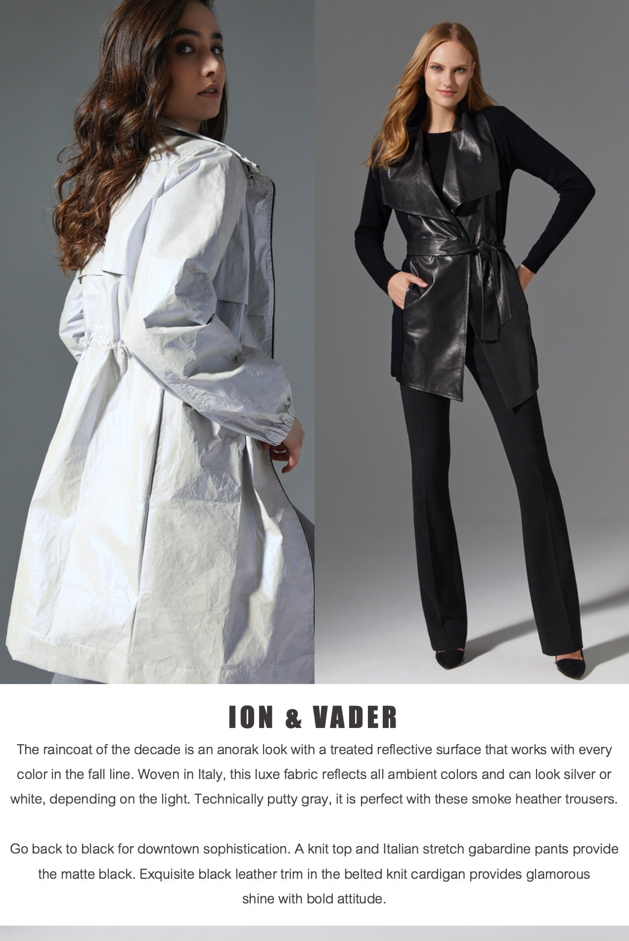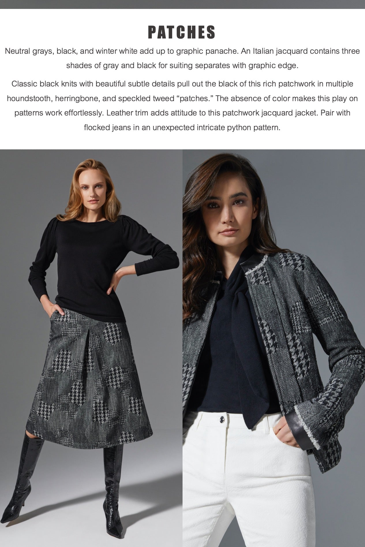 Contrasts of black, white, gray, and winter white are having a magical moment. Elegance resides in clean lines and simplified color palettes. Luxury resides in fabulous materials. Cashmere-softened cotton knits, pants in Italian gabardine and velveteen, European leather, and French metallic tweed distinguish fall ensembles. A patchwork jacquard from Italy alternates patterns of houndstooth, herringbone, and speckled tweed. Statement sweaters feature dynamic transitions from light to dark, one featuring foil print ombré and another in an intarsia knit. An iridescent raincoat simultaneously reads as white, silver, and gray, plus even more ambient shades. Posh details abound - an enigmatic gold tweed has a black warp thread while flocked black pants have a subtle smoke stripe. Red knits add color, but more importantly, they convey the richness of multi-directional Ottoman ribs. Easy outfitting comprises columns of solid black, gray tones, or black with bold contrasts of gold and red.