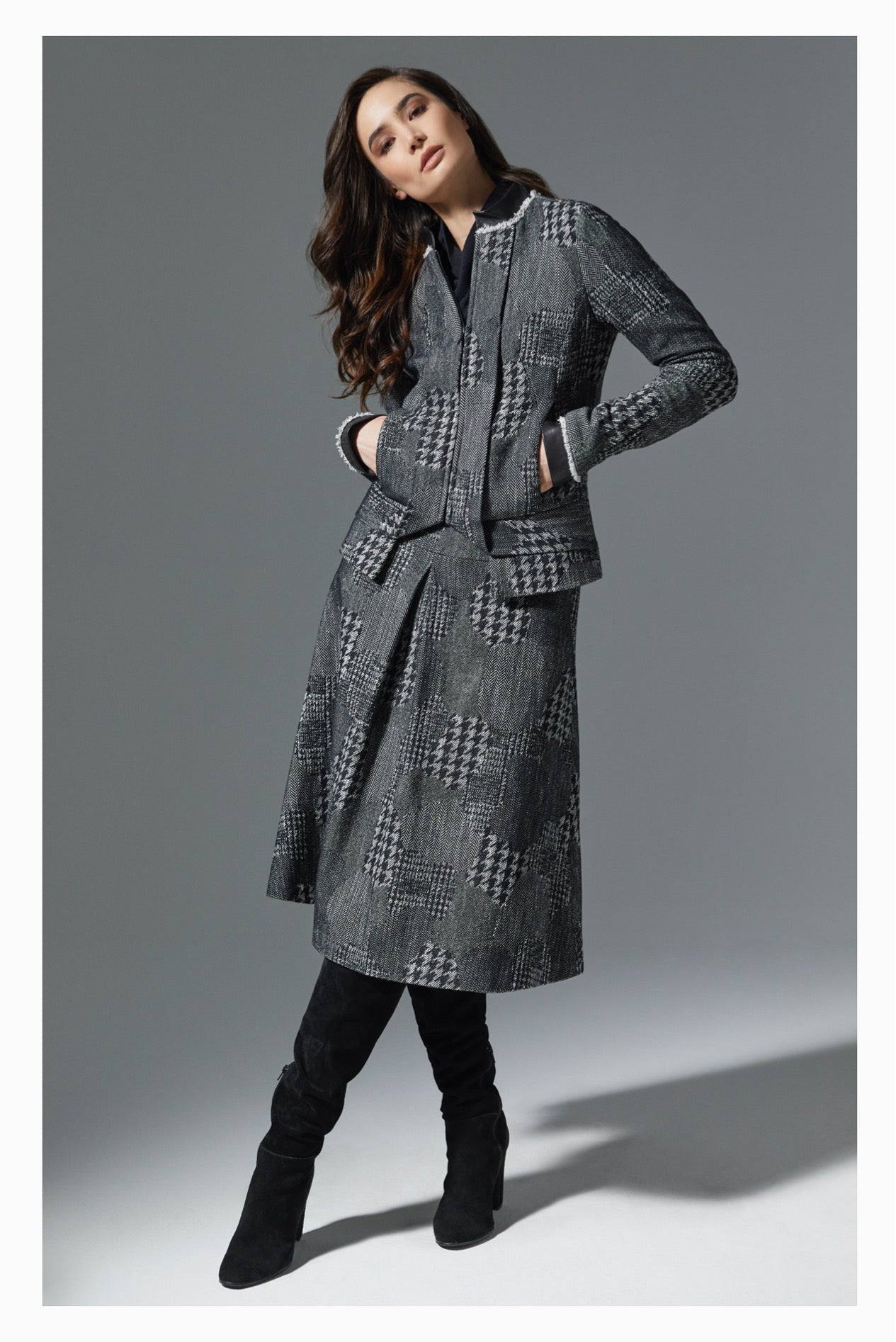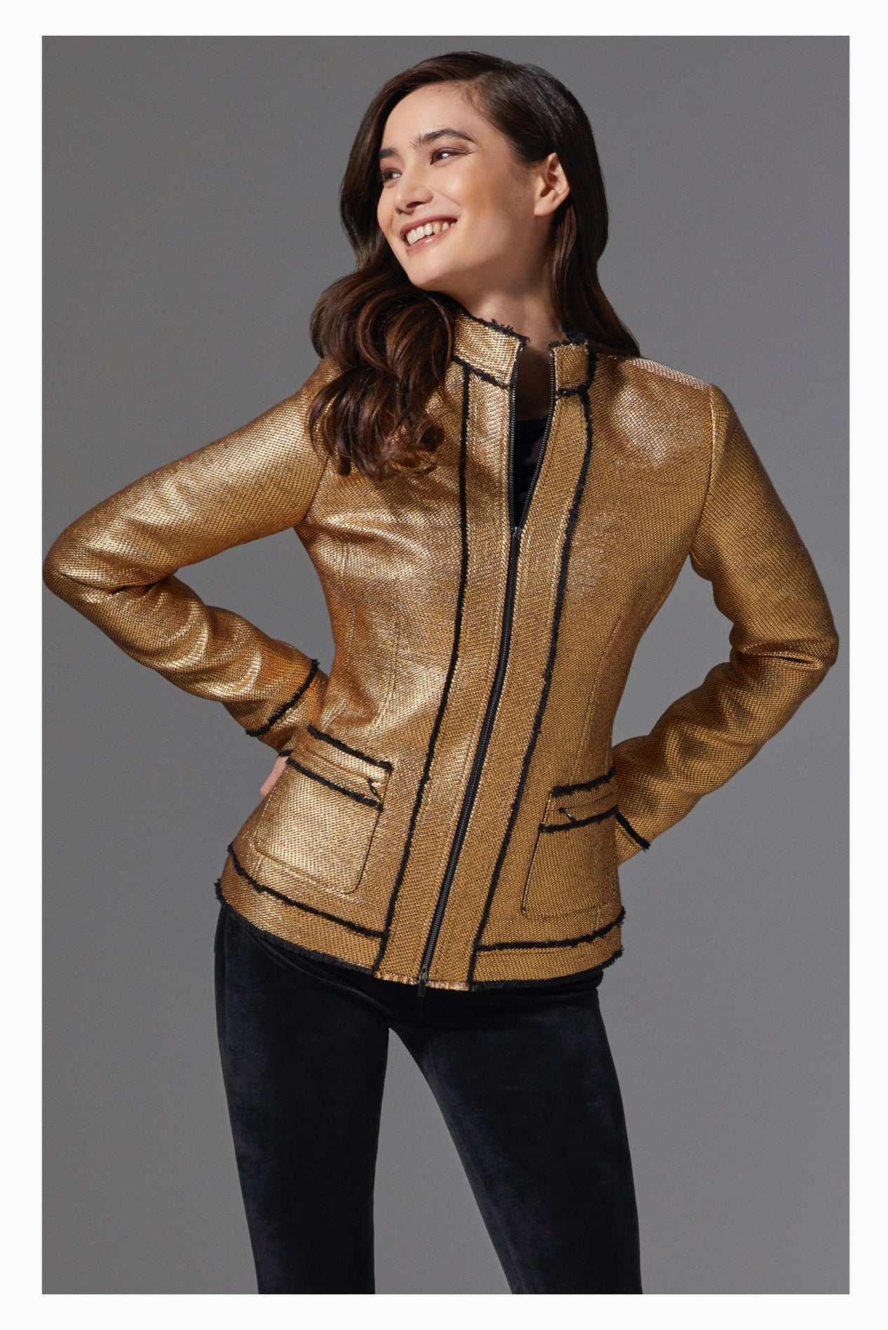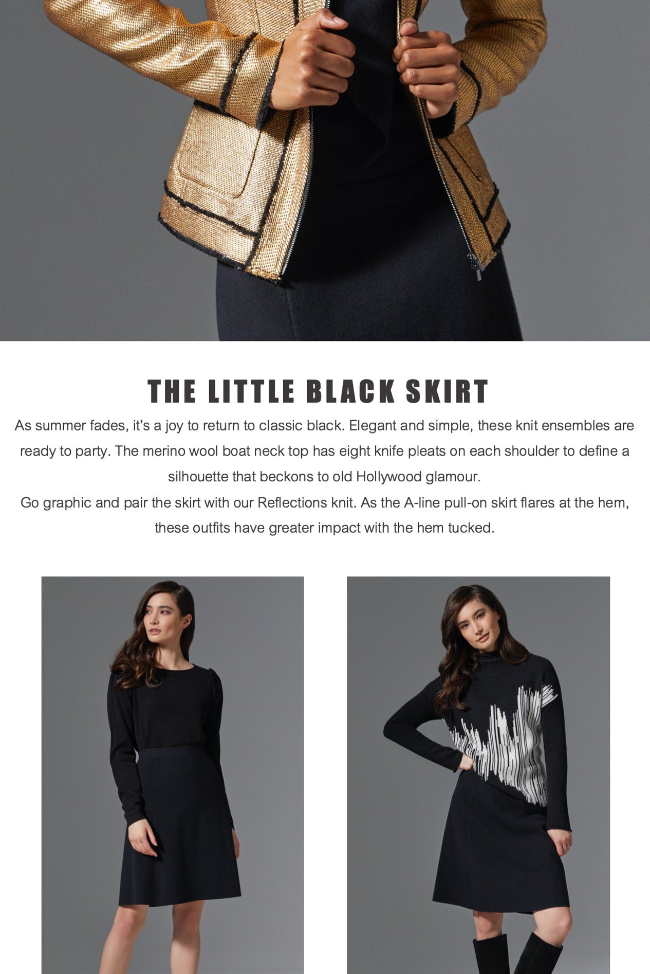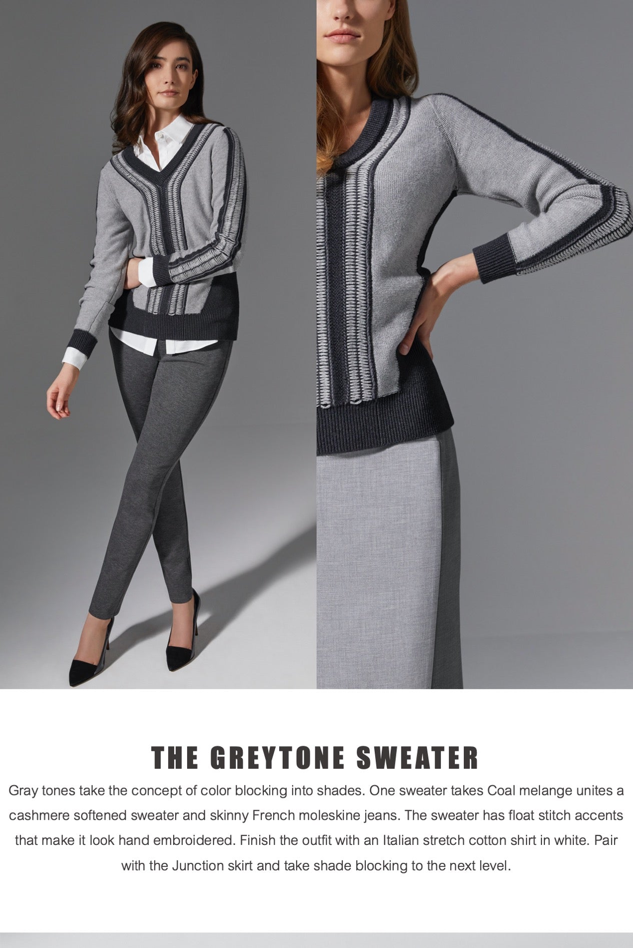 Contrasts of black, white, gray, and winter white are having a magical moment. Elegance resides in clean lines and simplified color palettes. Luxury resides in fabulous materials. Cashmere-softened cotton knits, pants in Italian gabardine and velveteen, European leather, and French metallic tweed distinguish fall ensembles. A patchwork jacquard from Italy alternates patterns of houndstooth, herringbone, and speckled tweed. Statement sweaters feature dynamic transitions from light to dark, one featuring foil print ombré and another in an intarsia knit. An iridescent raincoat simultaneously reads as white, silver, and gray, plus even more ambient shades. Posh details abound - an enigmatic gold tweed has a black warp thread while flocked black pants have a subtle smoke stripe. Red knits add color, but more importantly, they convey the richness of multi-directional Ottoman ribs. Easy outfitting comprises columns of solid black, gray tones, or black with bold contrasts of gold and red.
