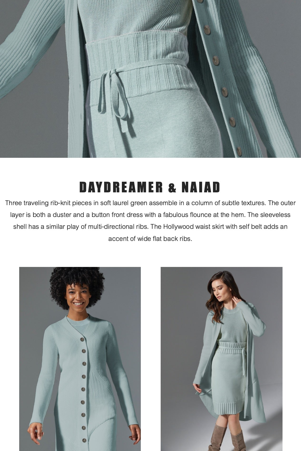 Neutral woven and knit pieces exude excitement through emphatic pattern. They include understated shade-blocking, a herringbone print, an abstract foliage print, and a wild ocelot knit jacquard. However, the colors are soft and subtle, from three tones of gray to a dusty laurel green. You can opt to make a strong statement by keeping these pieces together or enhance their versatile neutrality with a saturated bright.