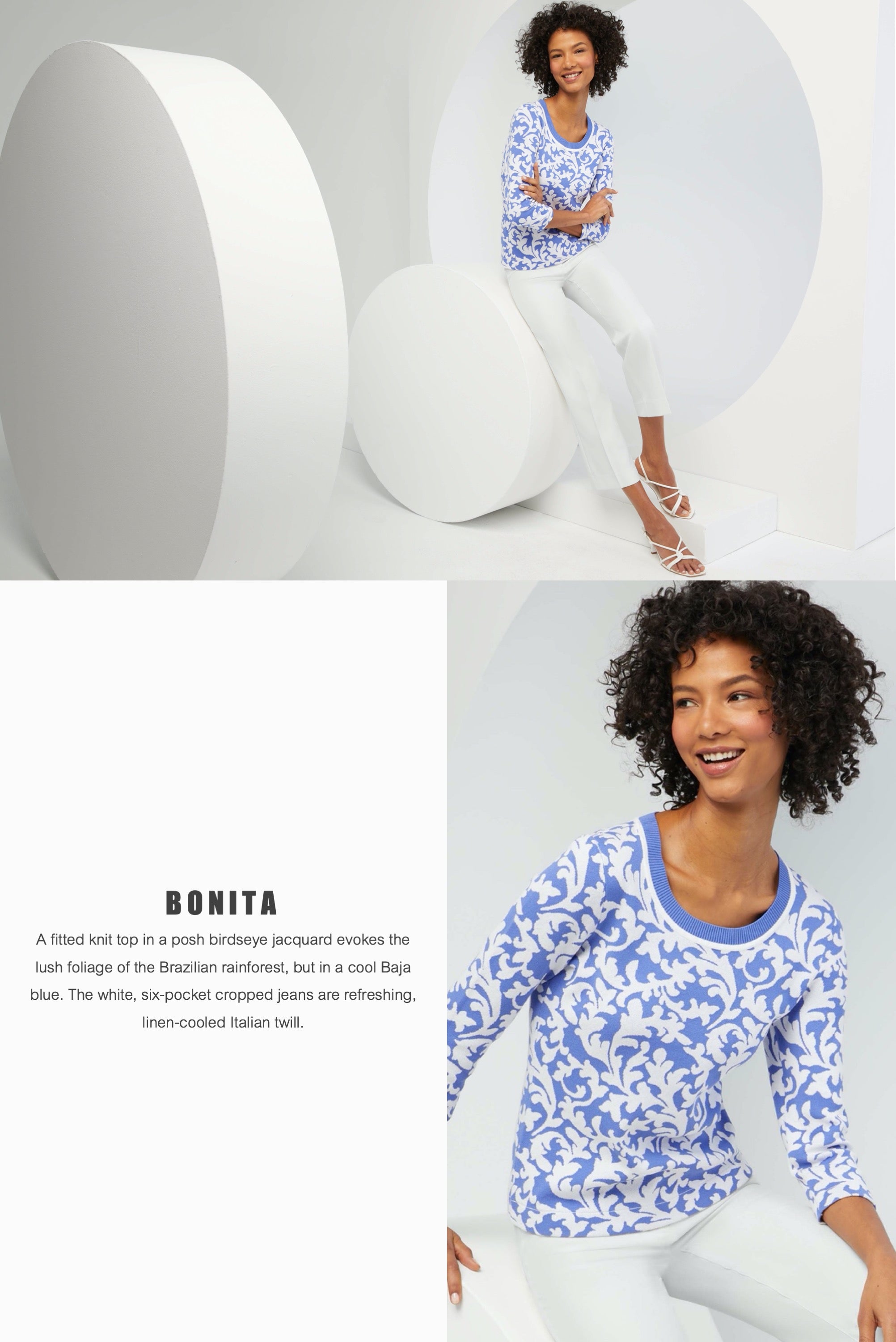 The perfect coastal summer date calls for a relaxed and comfortable design that is also current and appropriate for the occasion. A capricious sateen shirt dress achieves instant top-down coordination. The bodice is Wedgwood blue, which resonates with the pool and Baja blues of the wide attached skirt in a luxe watercolor plaid print. These looks capture the feeling of an endless summer. Sport a textured jacquard sundress in Bermuda aqua, worn as a duster over pure white separates with a silk watercolor scarf. The same print seen in the scarf adorns a flowy silk satin shift that will impress all parties at any summer gathering. It is as comfortable and breezy as it is elegant. Go from work straight to the beach in a graphically rich, varied-stripe blazer over pool blue pants.